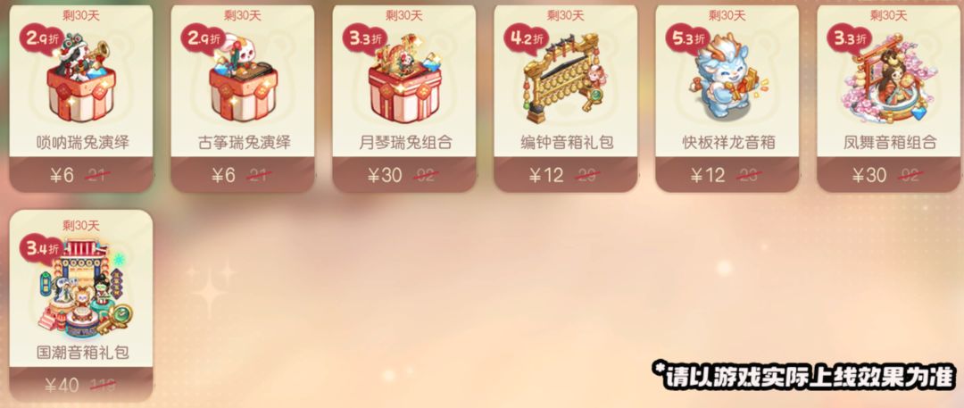 活动介绍:「奥柏百货」上架复刻限时礼包「唢呐瑞兔演绎」、「古筝瑞兔演绎」、「月琴瑞兔组合」、「编钟音箱礼包」、「快板祥龙音箱」、「凤舞音箱组合」、「国潮音箱礼包」折扣礼包,限时折扣优惠商品不可错过!