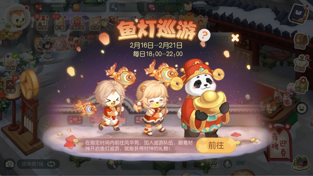 活动介绍:今年的风华节,园林中会在园林中某些特定时间举办鱼灯巡游。活动期间,小奥比们可前往风华苑找到风华节限定财神开启「招财进宝」状态,进入「招财进宝」状态后,小奥比可跟随财神一同在风华苑中巡游,期间每隔一段时间可获得一次财神赠予的奖励。活动期间每日首次获得的奖励必定为可随机得到68~88晶钻的「福缘晶钻袋」!