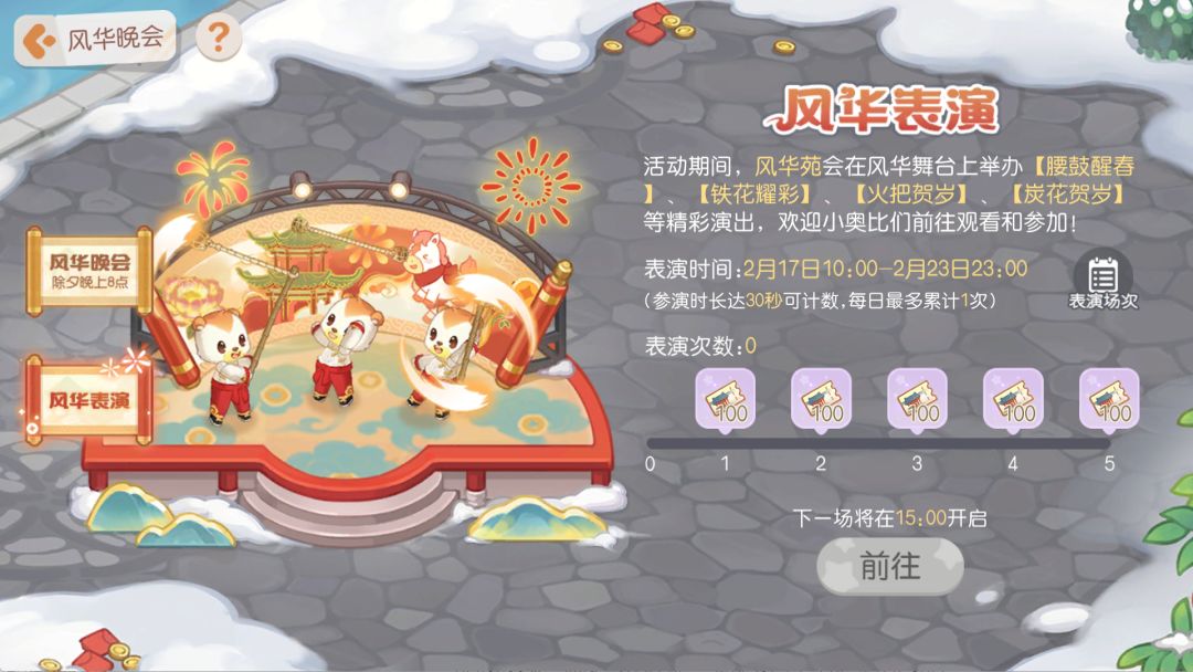 活动介绍:在活动期间,风华苑会在风华舞台上为大家举办【腰鼓醒春】、【铁花耀彩】、【火把贺岁】、【炭花贺岁】四种精彩演出,欢迎小奥比们前往观看和参加!每场表演时间固定,开始前3分钟可提前前往风华苑报名参加表演,若当前场景没有足够的表演位置,可选择前往其他线程参加表演,参加风华表演累积达到指定次数可领取参与表演的奖励。
