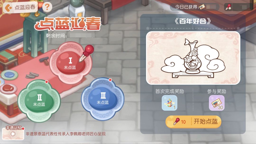 活动时间:2月10日5:00-3月2日23:59活动介绍:跟着老师学非遗,试着看看给即将完成的景泰蓝花瓶点上合适的颜色吧。首次完成本玩法即可获得限定贴纸素材「点蓝迎春」哦!