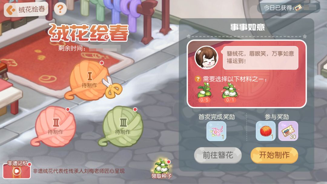 活动介绍:跟着老师学非遗,如果能将亲手制作的绒花戴在身上,那一定很特别吧?活动期间,前往活动场景找到「刘梅老师」,与其进行对话并选择“领取种子”,获得种子后,可在小岛岛建中选择并摆放,摆放后开始生长,一定时间后收获材料,即可前往「绒花绘春」中完成绒花制作啦。首次完成本玩法即可获得限定贴纸素材「绒花绘春」哦!