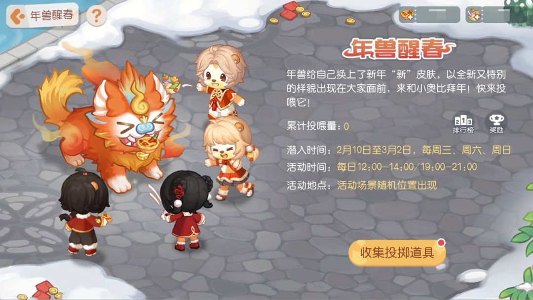 活动介绍:年兽给自己换上了新年“新”皮肤,以全新又特别的样貌出现在大家面前,来和小奥比拜年!快来投喂它!为了吃到更好吃的食物,它特意准备了礼物来和小奥比交换。不过它可不会先把礼物送出去的!它向小奥比们发起了一场挑战,只有让它吃饱,才能获得它准备的礼物。节日期间,年兽将在青木森林、淘宝街、奥比广场、奥比斯山脚、风华苑中随机一处出现,小奥比们前往年兽出现的场景,使用「香辣蛋挞」和「五色土沙拉」投喂年兽可以减少年兽的饥饿值,年兽饥饿值为0时会暂时离开奥比岛哦!此外,活动期间还会有限时的年兽投喂值排行榜,排行榜前的小奥比们可以获得大量精美奖励哦。