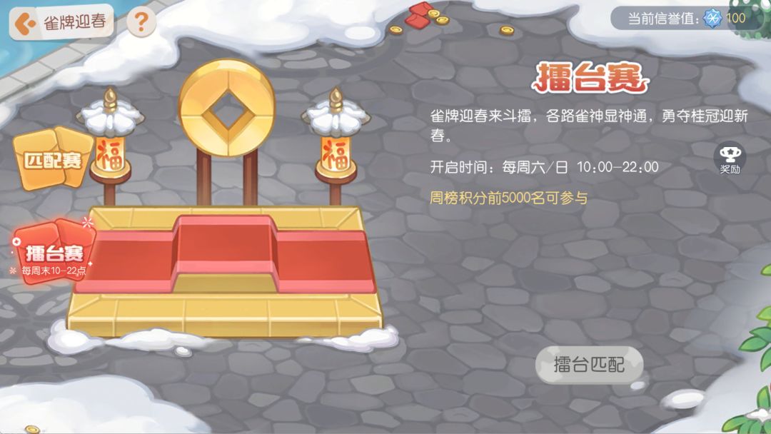 【擂台赛】于每周六、日的10:00-22:00期间开启,参加擂台赛的条件需要在匹配赛排行榜结算时进入前5000名。因周六、日举办【擂台赛】,在此期间参与【匹配赛】将不计算得分。