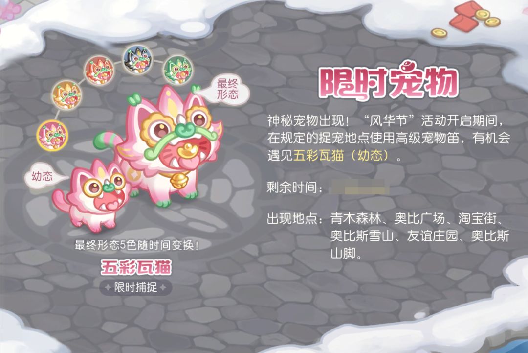 活动介绍:神秘宠物出现,风华节活动开启期间,限定宠物「五彩瓦猫(幼态)」将会出现在奥比岛。前往岛内捉宠地点,使用高级宠物笛有机会和宠物相遇哦!本次限时宠物「五彩瓦猫」的最终形态可随时间5色变换!