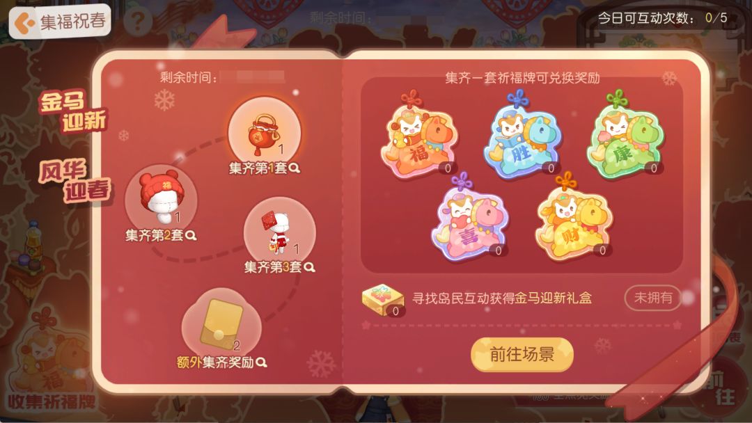 活动介绍:在2月10日5:00-3月2日23:59期间奥比们首次登录即可领取「时空之钥」、「高级宠物笛」、「晶钻服装彩蛋锤」、「晶钻家具彩蛋锤」、活动限定装扮「小马连体衣」、「福到我家福娃衣」、「恭喜发财福娃衣」、活动限定家具「雀神沙发(随机)」等版本更新福利!部分奖励为社区互动奖励,互动达标后可拿齐所有奖励。