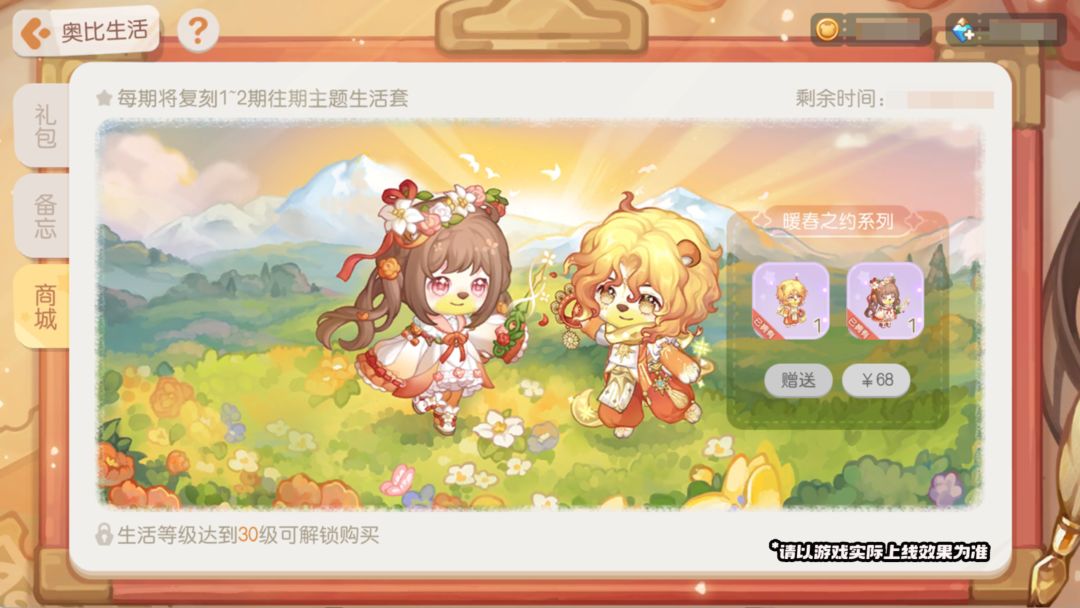 温馨提醒:购买本次两套返场装扮「暖阳使者套装」「永恒之春套装」不等同于解锁本期剧目生活系列的「精致生活」和「豪华生活」。