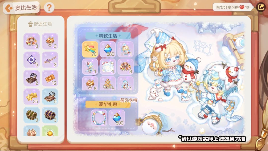 活动周期内,升级解锁精致生活礼包,立即赠送礼包等级10级。完成每日备忘,达到对应礼包等级即可解锁等级奖励,精致礼包奖励包括时装「白雪邀约套装」「白雪娃娃套装」、装扮散件「纯洁冰晶发夹」「晴空融雪眼镜」「暖绒雪人手套」、家具「霜花亭雪橇车」「霜花暖梦小灯」、背景卡「童话雪境背景」及丰厚的晶钻彩蛋锤、高级彩虹星星等其他珍贵礼物。