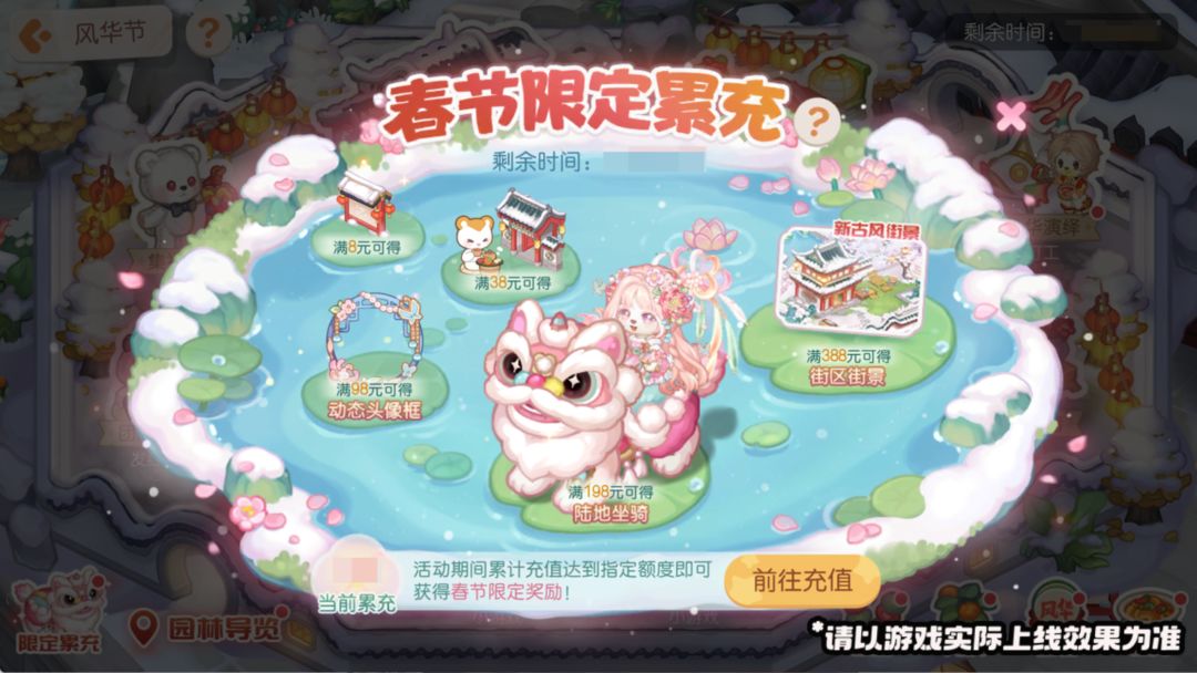 活动介绍:春节限定累充活动限时开启,在活动期间,在游戏内进行任意充值可累积充值额度。当累积充值额度达到对应的档位额度时,可点击领取对应档位的奖励,丰厚的奖励包括街区街景「锦绣风华园」、陆地坐骑「绒绒醒狮」、动态头像框「绒影摇春」、街区大门「锦绣风华大门」、街区门牌「锦绣风华门牌」等,快来参与吧!