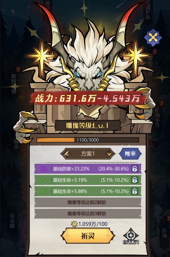 › 核心玩法:消耗【阳光】进行祈灵,随机生成属性词条。每次祈灵可提升雕像经验,等级越高,词条属性越强。