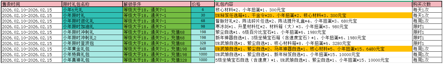 小年·内:红色武魂自选宝箱,6级百分比宝箱,10000元宝,UR卡牌任选宝箱,UR秘笈任选宝箱,巅峰神器自选箱。