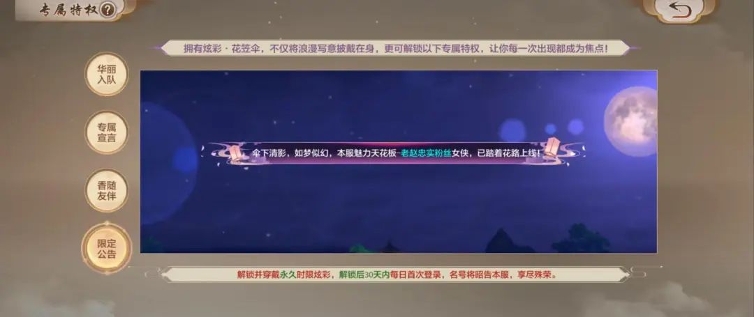 少侠解锁后,不仅能自定义进队宣言,搭配流光溢彩的入队界面特效,每一次登场都自带高光;