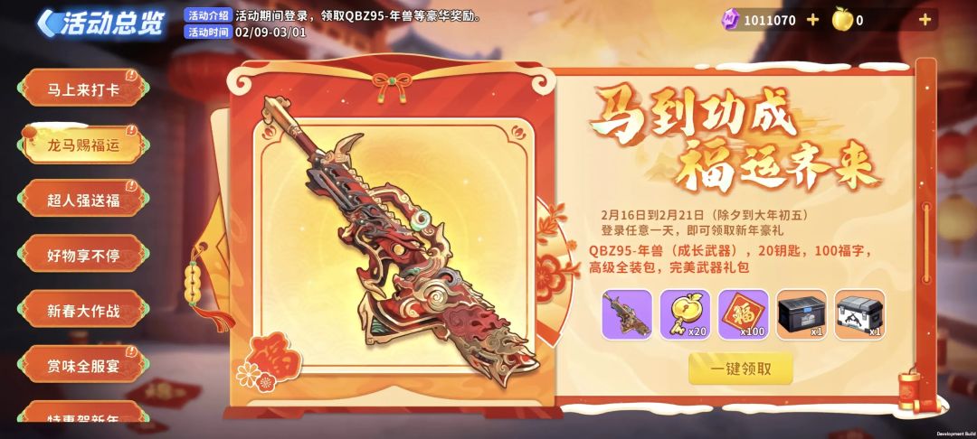 [活动介绍]:2月9日-3月1日,除夕到大年初五登录任意一天,即可领取永久成长神话武器:“QBZ95-年兽” ;