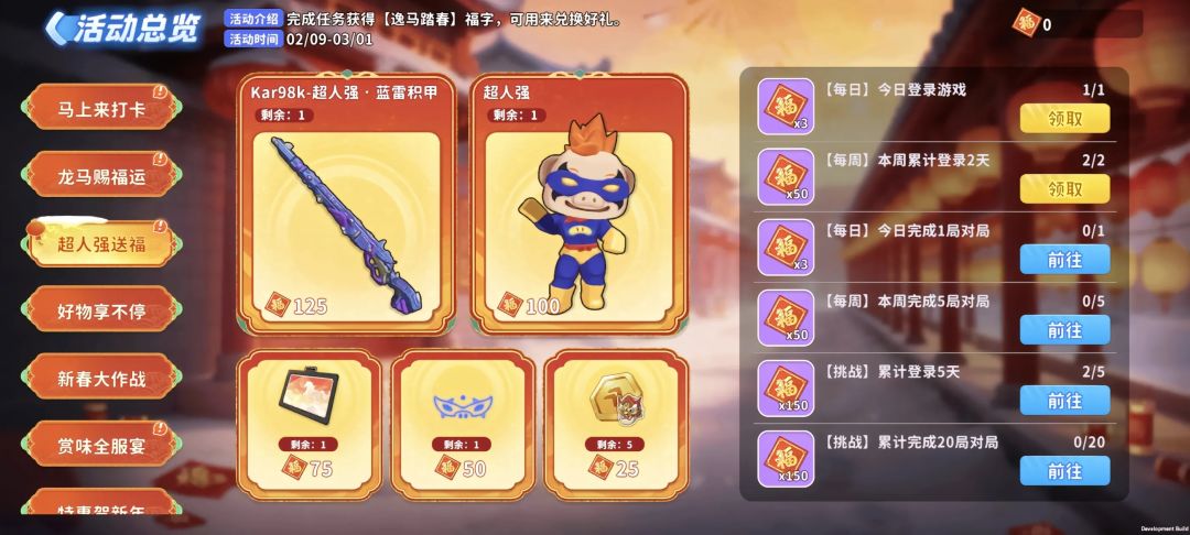 [活动介绍]:2月9日-3月1日,完成任务获得 “福字” ,累计 “福字” 可兑换 “Kar98k-超人强 • 蓝雷积甲” , “角色一超人强” , “年兽成长币” 等;