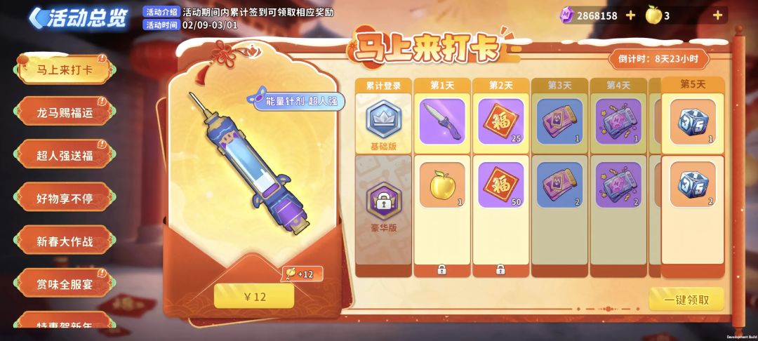 [活动介绍]:2月9日-3月1日,每日签到领好礼,累计签到7天奖励,奖励分为普通奖励和豪华奖励,豪华奖励充值解锁签到奖励;