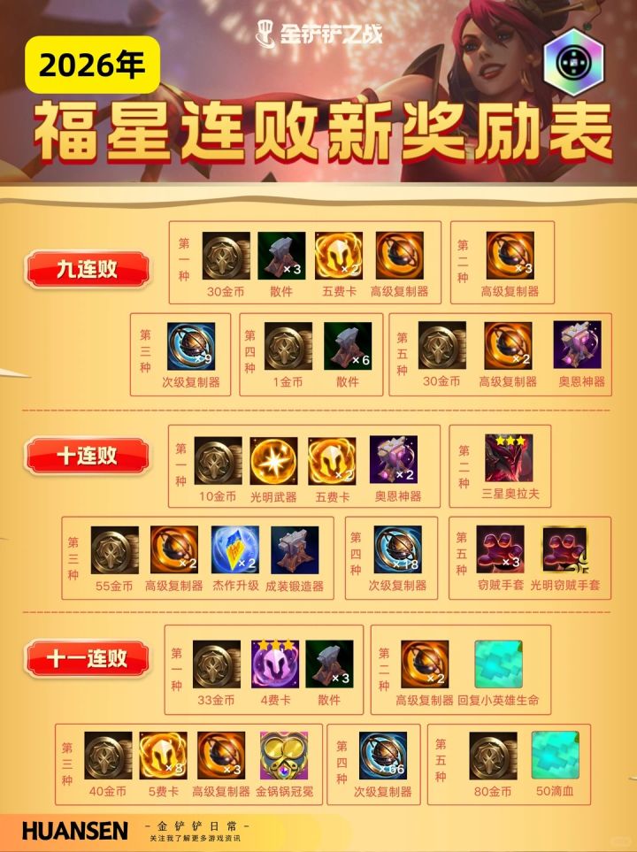 金铲铲2026天选福星最新连败奖励表来啦~这次奖励跟以往的不太一样嗷~部分做了调整,最近马年春节快到啦~另外很多都是随机出哒,宝宝们要是想要铲子或者不清楚哪一层有什么奖励都可以来查奖励表噢~