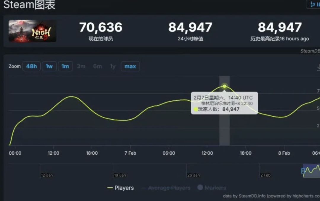据SteamDB最新统计,Team Ninja旗下动作RPG新作《仁王3》于近期夜间时段,在Steam平台创下84947人同时在线的峰值纪录,成功超越发售初期70186人的在线成绩,刷新本作自身与系列历史峰值。截至目前,游戏实时在线人数仍稳定在7万以上,热度持续走高。