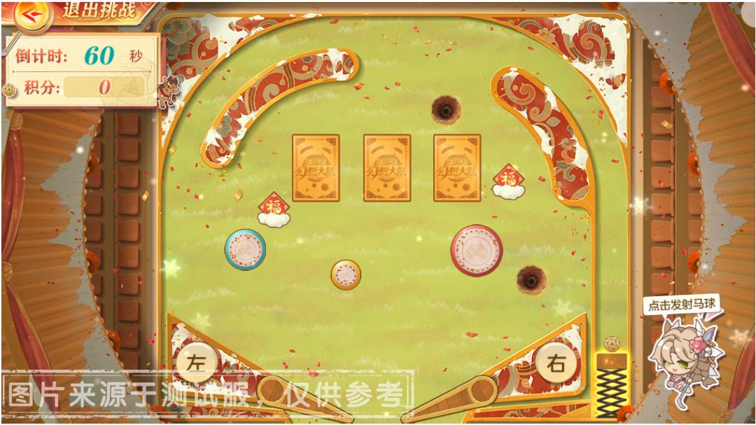 活动开启后将会从左到右解锁关卡,一共有四种不同的活动关卡。第一关为基础关卡,后三关内的马球则会自带不同的技能和玄机哦。进入关卡内,小将军点击右边武将小人形象发射马球,马球将被弹射到马球场内进行碰撞,马球通过撞击不同的建筑物和场上道具获得对应积分,当马球触碰到中央福卡可进行一次翻转,单局福卡全部朝上可将触发高额积分。注意按动马球场底部的【左】、【右】键防止马球掉落到场外哦。每局挑战限时60秒,一起来看看谁能获得最多积分!