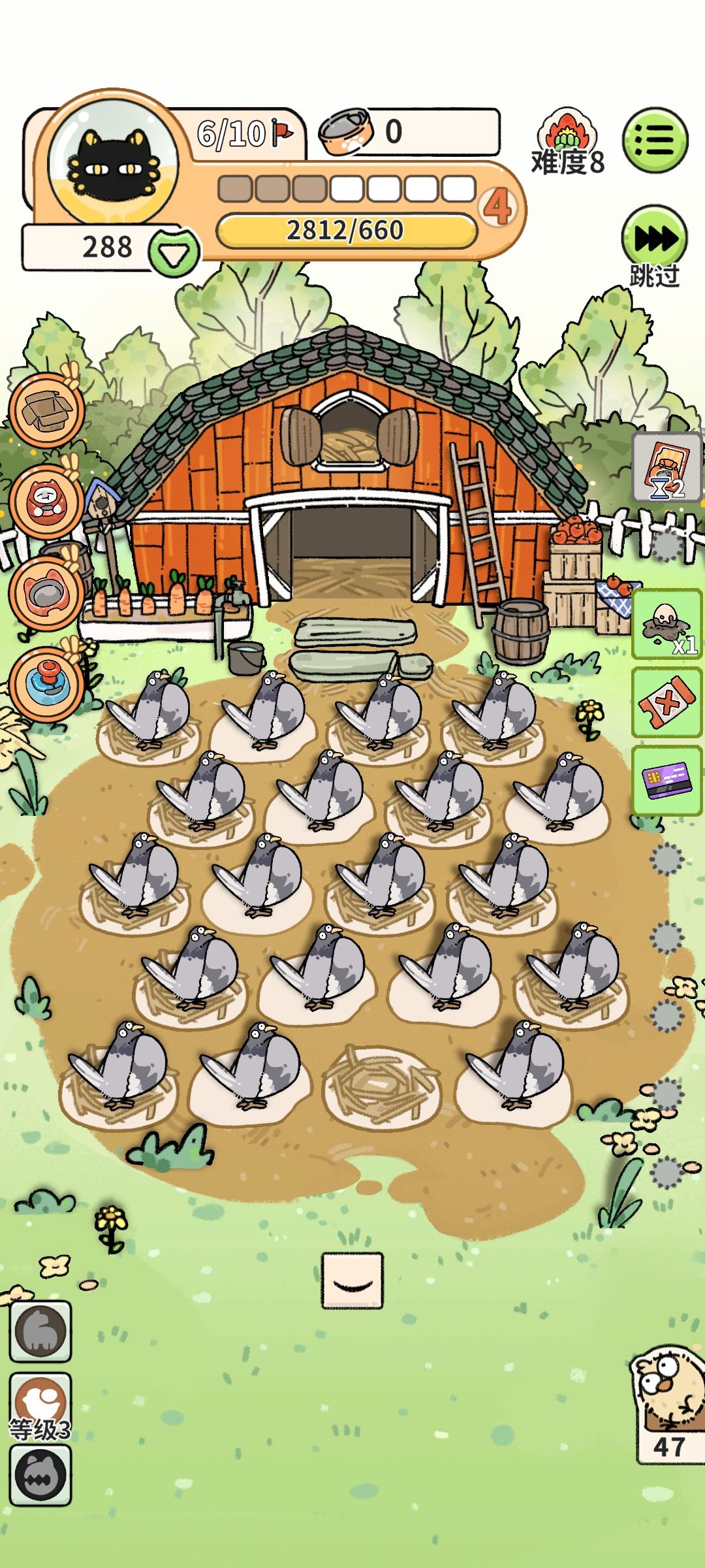 操作:蓝色动物推荐驯鹿、雌犀鸟、喜鹊、羊驼皆可;道具玉米粒。全程不选动物点跳过,只依赖20只鸽子就通关了。商店优先把三级鸟类天赋点满,其他看情况获得罐头的。难度七以前只需要20只鸽子,八九遇到孔雀恐怖鸟可拿。