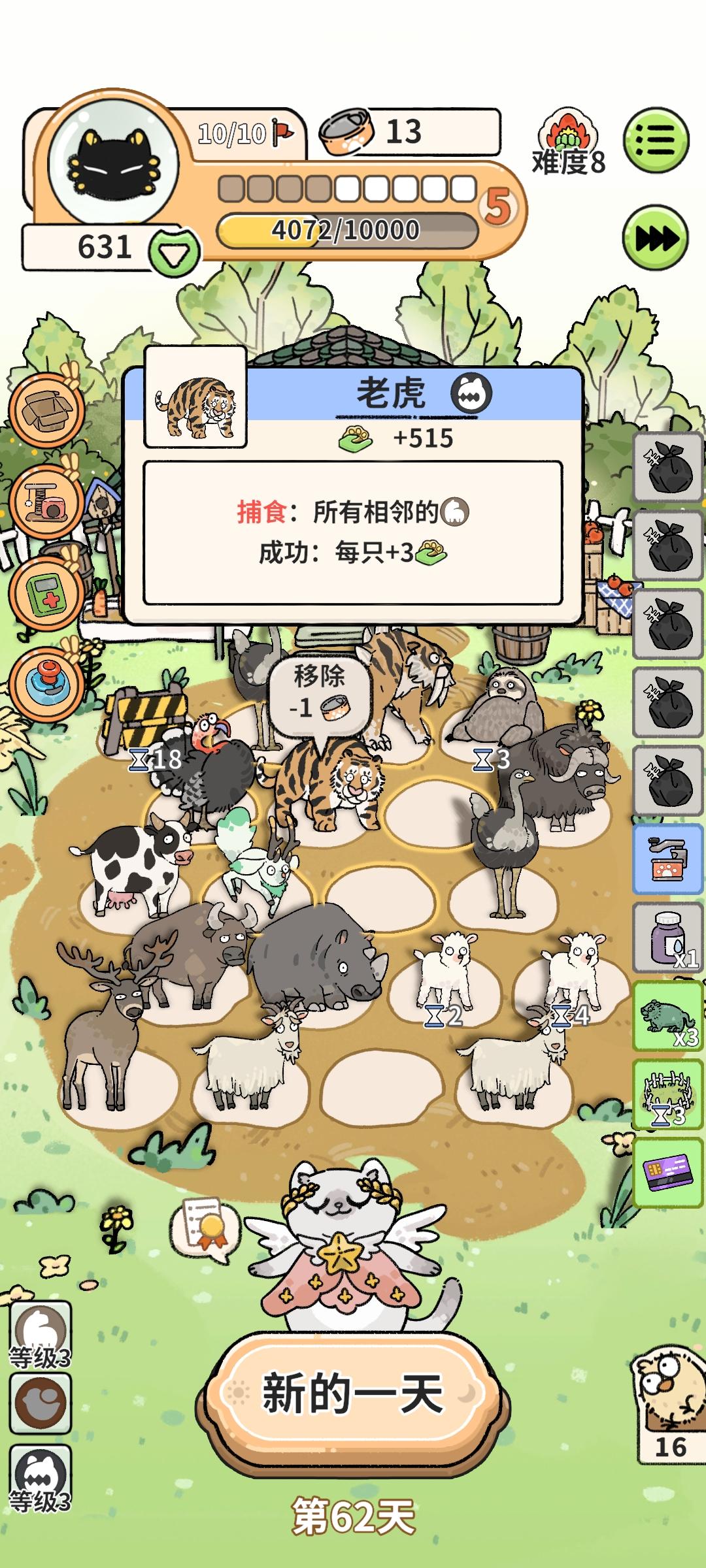 操作:开局选老虎和开罐器/草棚/香薰蜡烛等;然后动物一直选有蹄喂给老虎就行,养单核。优先捕食类道具和三级捕食天赋,地形不重要。