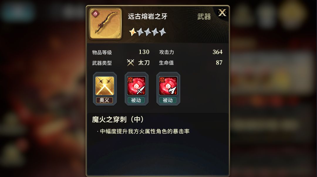 第四个是武器[远古熔岩之牙],这把武器有两个[武器的被动],一是:中幅度提升我方火属性角色的攻击力,二是:中幅度提升我方火属性角色的暴击率。这里有一个重要的概念出现:[暴击率],队伍具有该数值的概率在造成伤害时[暴击],而[暴击]会使该次伤害的伤害量提升50%,这也算是一种另类的攻击力乘区,这是把比较优秀的武器,其它事项同上