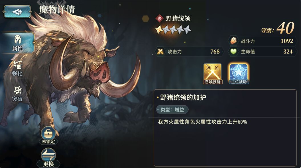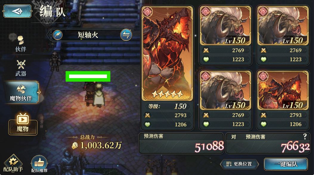 其实只要是150级5星的SSR阶[魔物伙伴],它们的[攻击力]、[生命值]都差不多,没必要刷5只[苏尔特尔],如下图,我个人选择在[副位魔物]位上放3只[野猪统领]、1只[苏尔特尔],可以看到[野猪统领]的[攻击力]2769只比[苏尔特尔]的[攻击力]2793低24,约等于相同了。由于我们后续还会刷其它[始源巨兽]系列的副本Boss,同样也要至少刷1只150级5星的[魔物伙伴],之后再把它们放在[副位魔物]位上就行