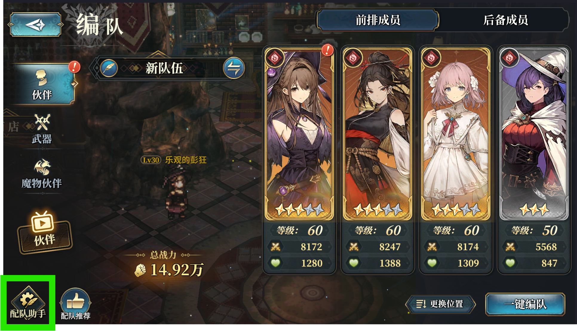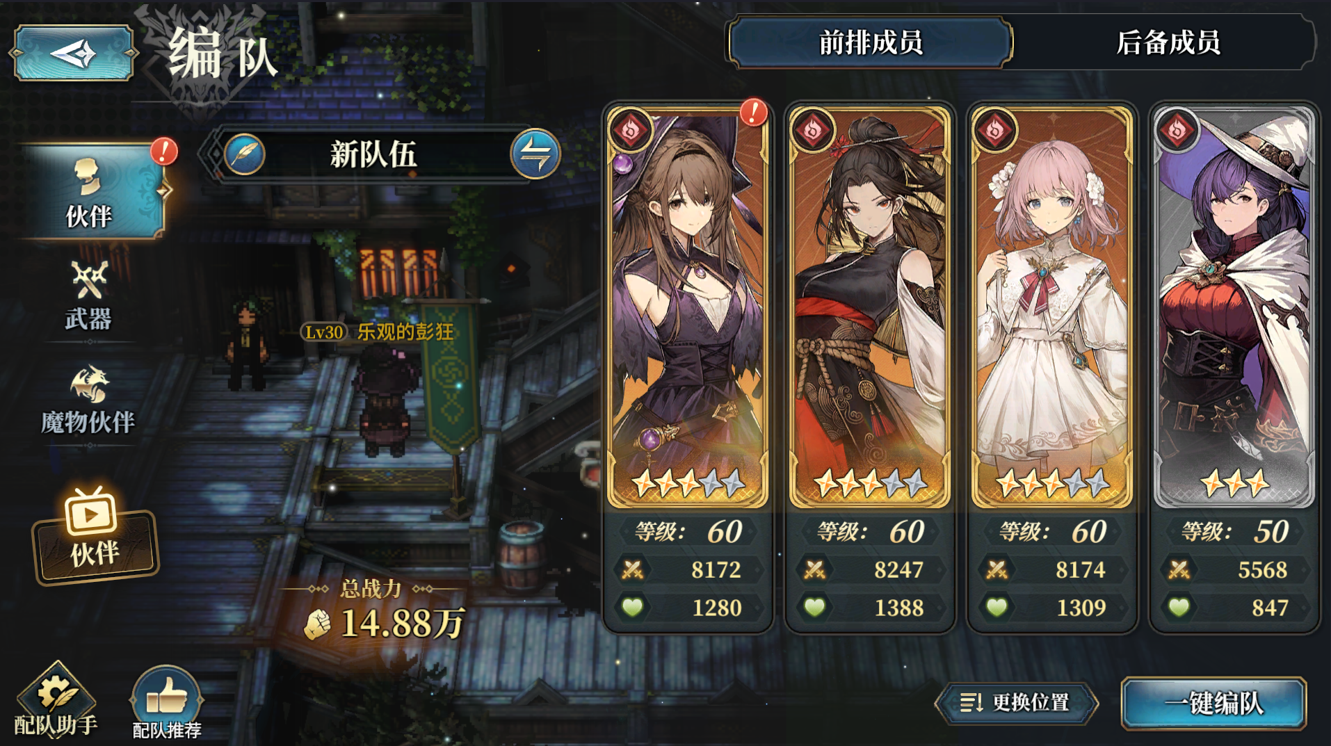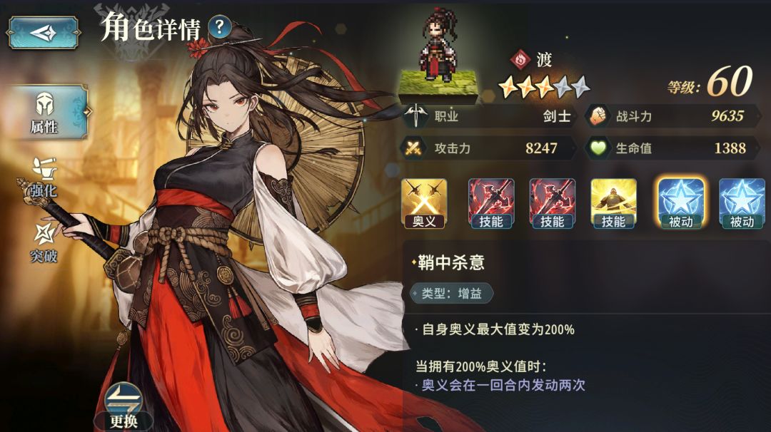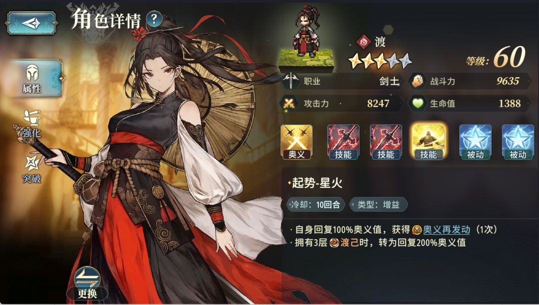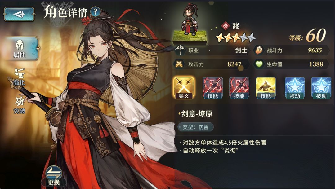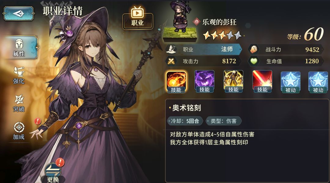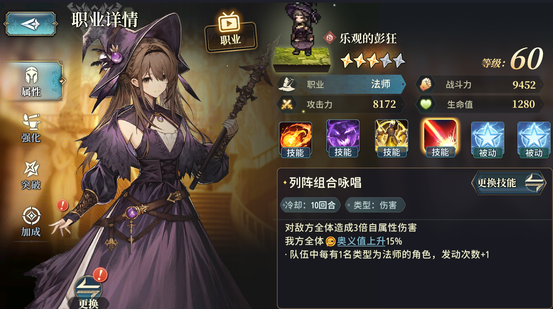 我们将队伍中的角色升到60级、3星就可以来学习简单的配队思路和技能轴了(主角要60级才能学完所有技能),首先我们要在主角的详情页面将主角的技能装上去