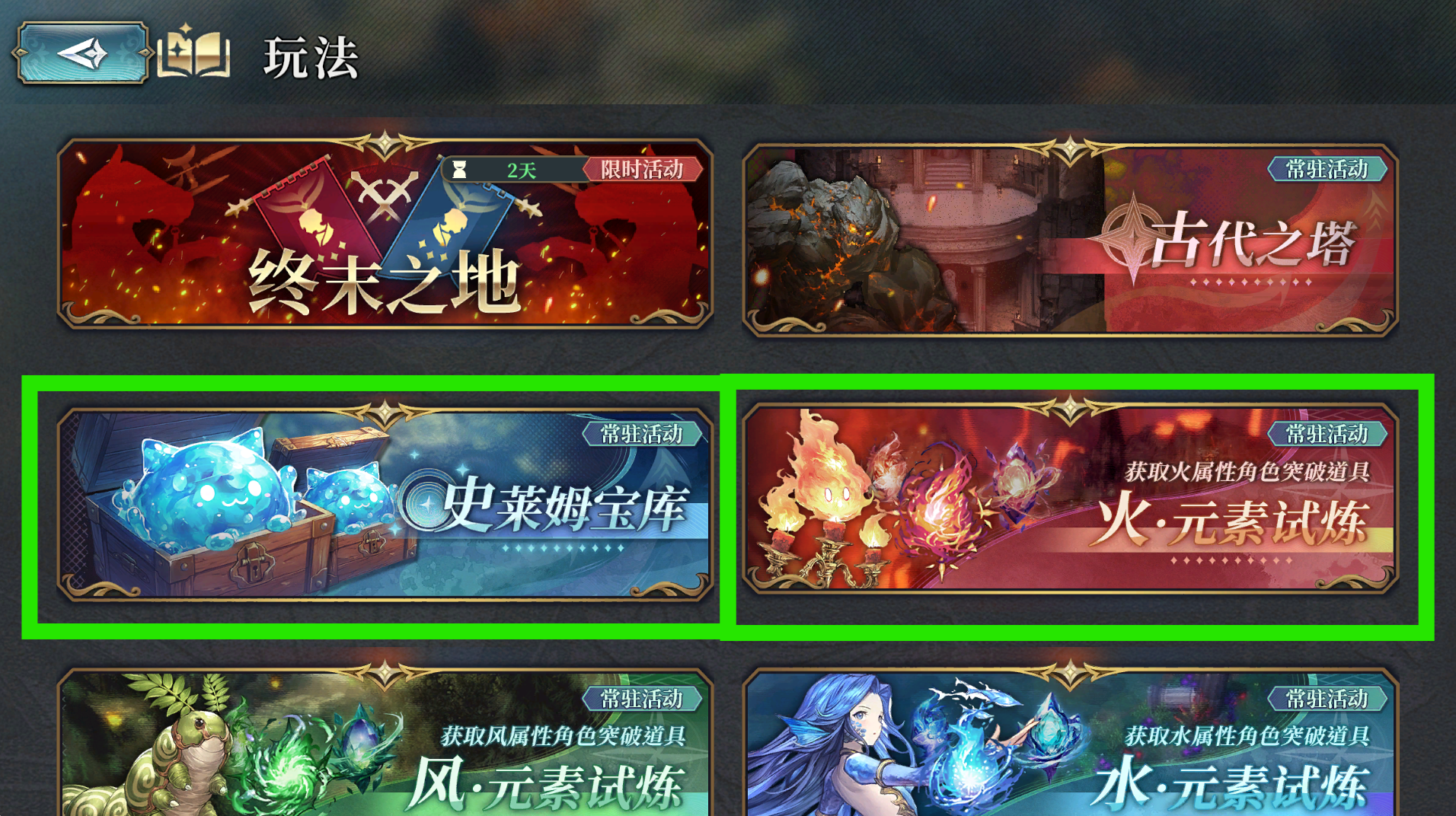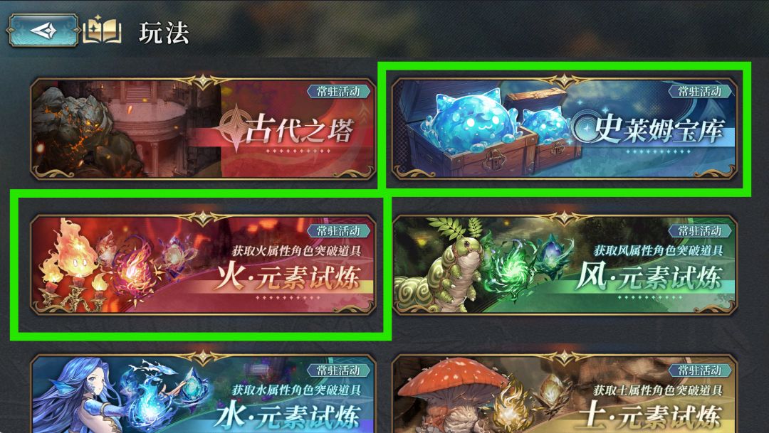 我们需要刷取[玩法]中的[史莱姆宝库]和[火元素试炼],从而强化和突破我们的队伍中的角色到60级和3星(R阶角色最高只能到50级),[史莱姆宝库]和[火元素试炼]的高难度副本我们可能打不过,打简单的慢慢刷就行