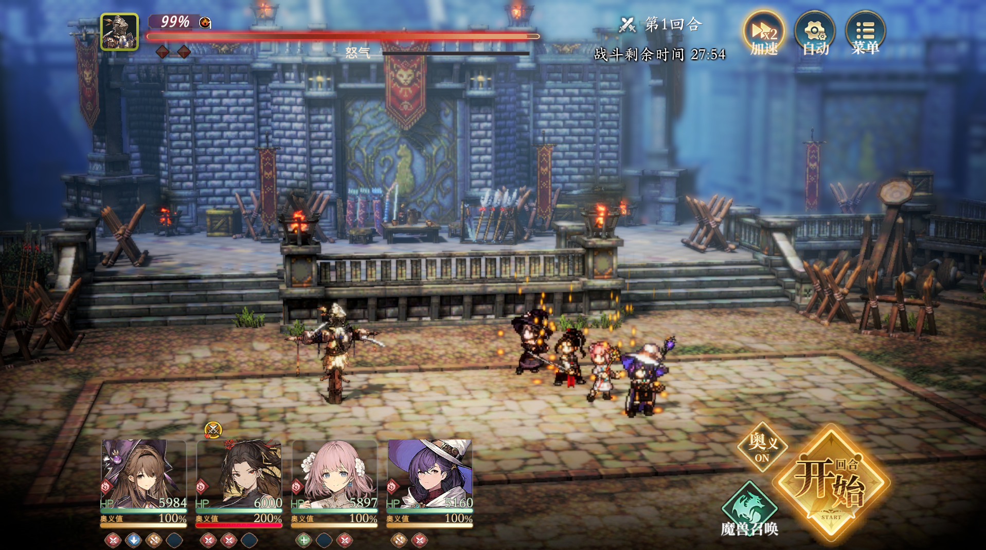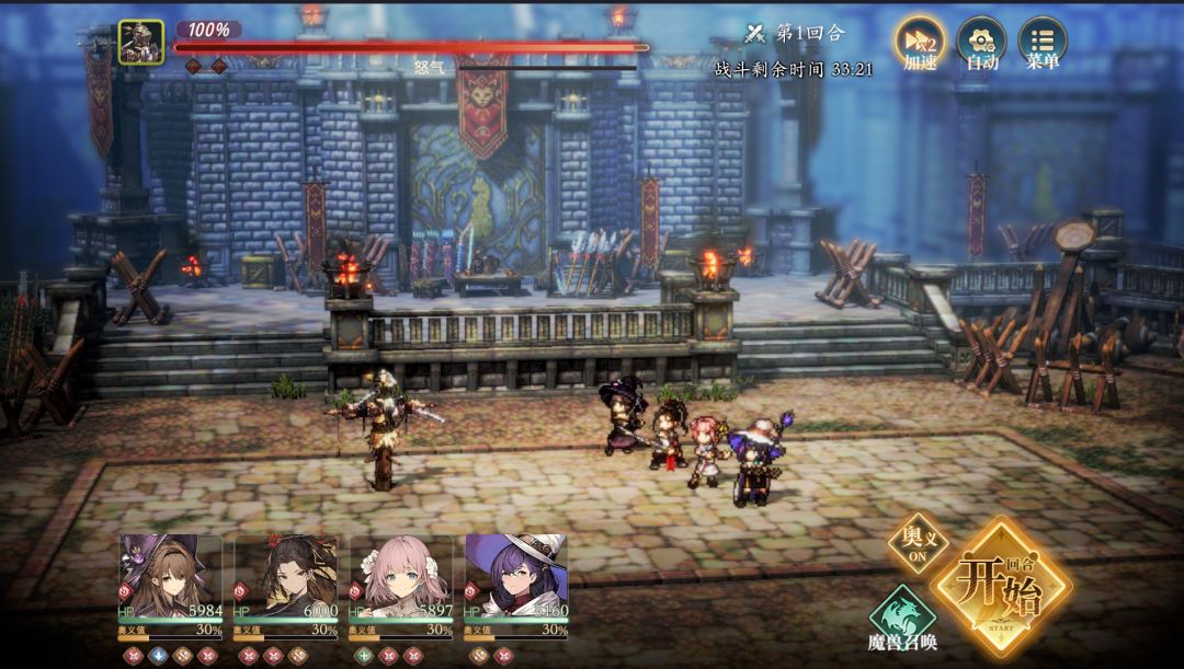 我们在使用该队伍挑战每个Boss的基本流程都是如此,战斗开始后,释放3个技能,点击[回合开始],这也就是[3 + 1 键]队伍。由于我们只打一回合爆发,这是非常流程化的东西,每次都手动操作十分麻烦,所以我们可以配合游戏中的[技能轴]系统,简化我们的游戏操作