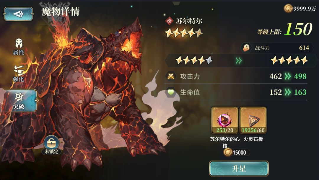 然后是[魔物的突破],也就是升星,在升至5星前,每次[苏尔特尔]升星都需要消耗1只[苏尔特尔]——什么等级星级的都可以,一般我们也就是用1只1级1星的[苏尔特尔],故将1只[苏尔特尔]升到4星,在包含本体的情况下,需要4只[苏尔特尔],而第5颗星的突破需要下图所示的材料