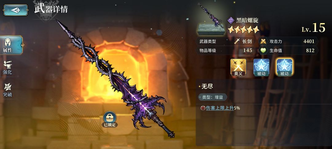 第五个是武器[远古熔岩之锋],这把武器有两个[武器的被动],一是:中幅度提升我方火属性角色的攻击力,二是:中幅度提升我方火属性角色的奥义伤害和奥义伤害上限,这里再次出现[伤害上限],现在暂时不讲,下文马上讲。我们这里只要知道这把武器可以增加我们队伍的[奥义]伤害,适配于[短线爆发]队伍,其它事项同上