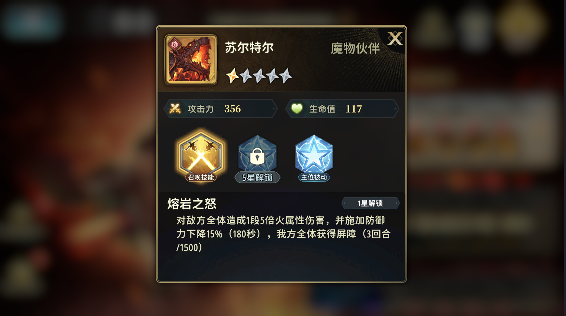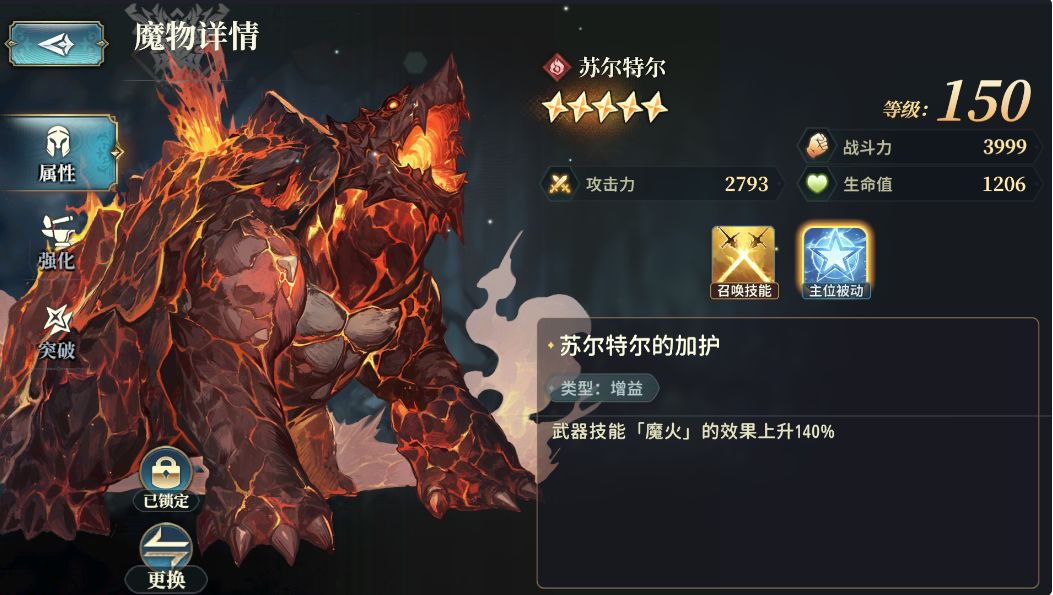 第一个是[始源巨兽]系列副本的[魔物伙伴]\[苏尔特尔],我们需要刷1只150级5星的[苏尔特尔]放在我们[魔物伙伴盘]的[主位魔物]位上,这个下面会详细讲,这里我们只需要了解就行——该[魔物伙伴]的掉落概率比较低