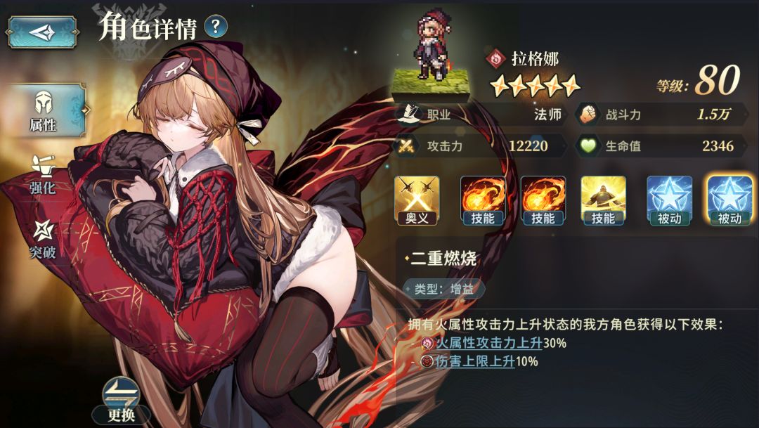 然后是2号角色:[索菲亚],首先她的技能[灼燃]可以为我们队伍里的每个角色都提供25%的[奥义值],其次她的被动可以提高自己的[奥义]伤害,和我们[奥义]\[短线爆发]队伍的思路相契合,而且她是主线赠送角色,对新手配队来说,非常好用(不过只有火队能用)