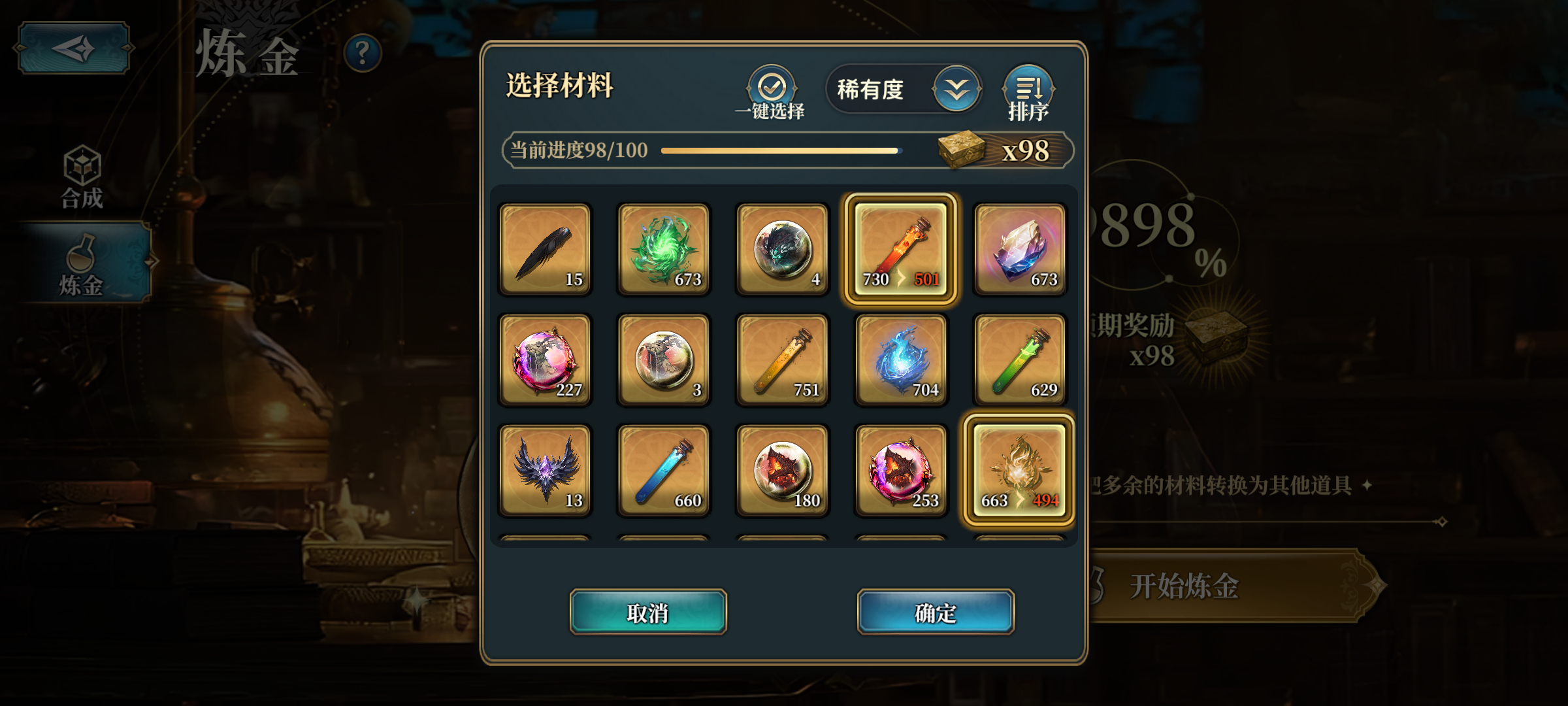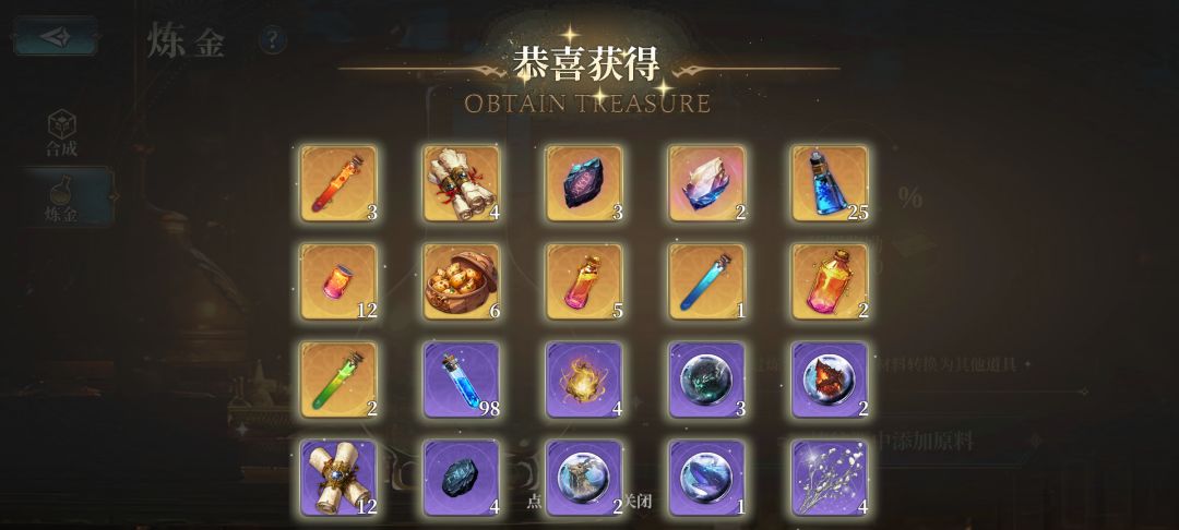 点击[确定]后,再点击[开始炼金],我们就会得到大量的[体力药]、[精力药]