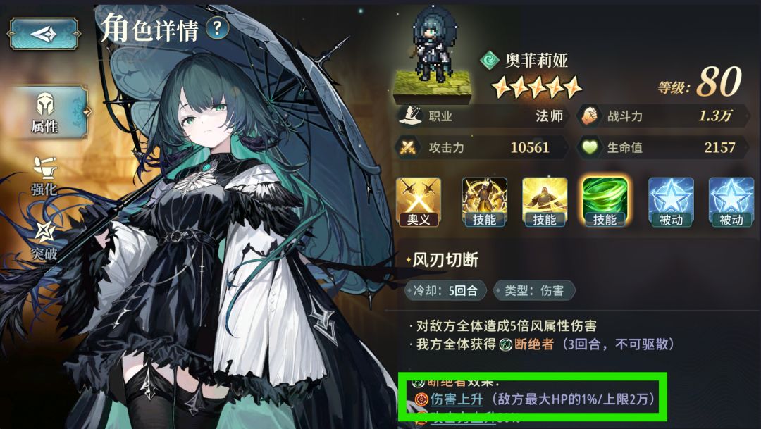 首先是0号角色:[法师]主角:她的技能[列阵组合咏唱]可以为我们队伍中的每名角色增加15%的[奥义值],且队伍中每有一名[职业]为[法师]的角色,该技能的发动次数就会加一,这是指:假如我们队伍中在包括主角自身的情况下有2名[法师],那么该技能就会提供45%的[奥义值],如果我们队伍中在包括主角自身的情况下有3名[法师],那么该技能就会提供60%的[奥义值],这个就是大部分[奥义]\[短线爆发]队伍的核心技能,我们由此来构建队伍