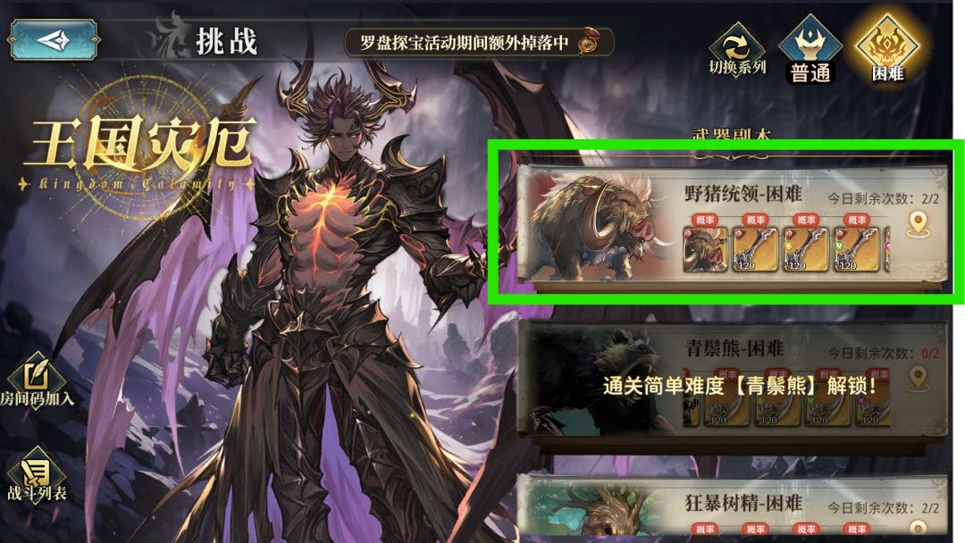 [0.5武器盘]指的就是全部由[王国灾厄]系列副本中的[方阵武器]组成的[武器盘],[王国灾厄]系列中共由4种Boss副本,[野猪统领]、[青鬃熊·]、[狂暴树精]、[猩猩王]对应[火]、[水]、[风]、[土]4种[属性]的队伍,什么[属性]的队伍就刷什么[属性]的Boss,从而获取对应[属性]的[方阵武器],因为我们新手攻略配队是[火属性]队伍,所以我们就刷[野猪统领]
