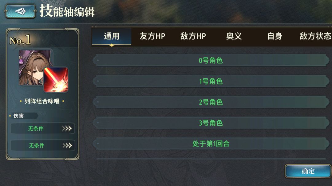 [0号角色]等:代表该技能只会对指定位置的友方角色释放——只对单体目标生效的技能才适合于该条件,如果是全体技能,你设定的该条件没有效果