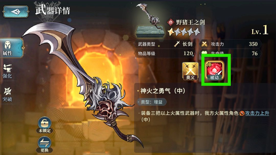 [野猪王之剑]最关键的特点是它的[武器的被动]:[神火之勇气],在装备三把以上火属性武器时,我方火属性角色攻击力上升(中),这个被动可以大幅度提升我们队伍的战斗力,其他[属性]的[武器盘]刷取思路也是如此