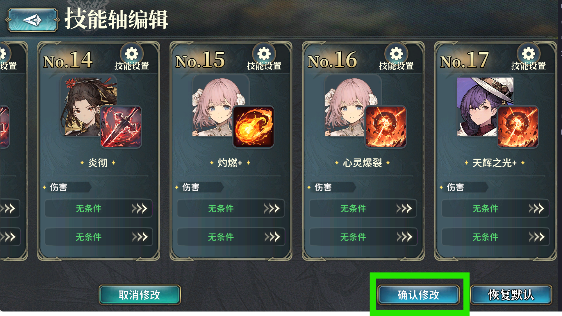其他的条件各位可以自己慢慢探索,本文则不再赘述,至此,一只队伍的基础配队思路和[技能轴]编辑知识我们已学习完毕