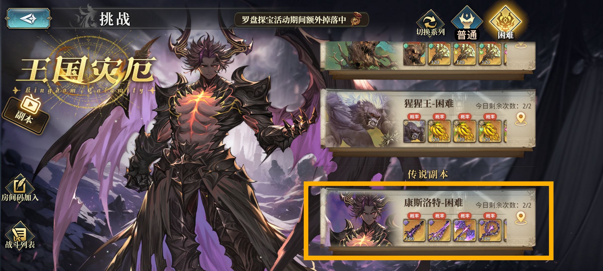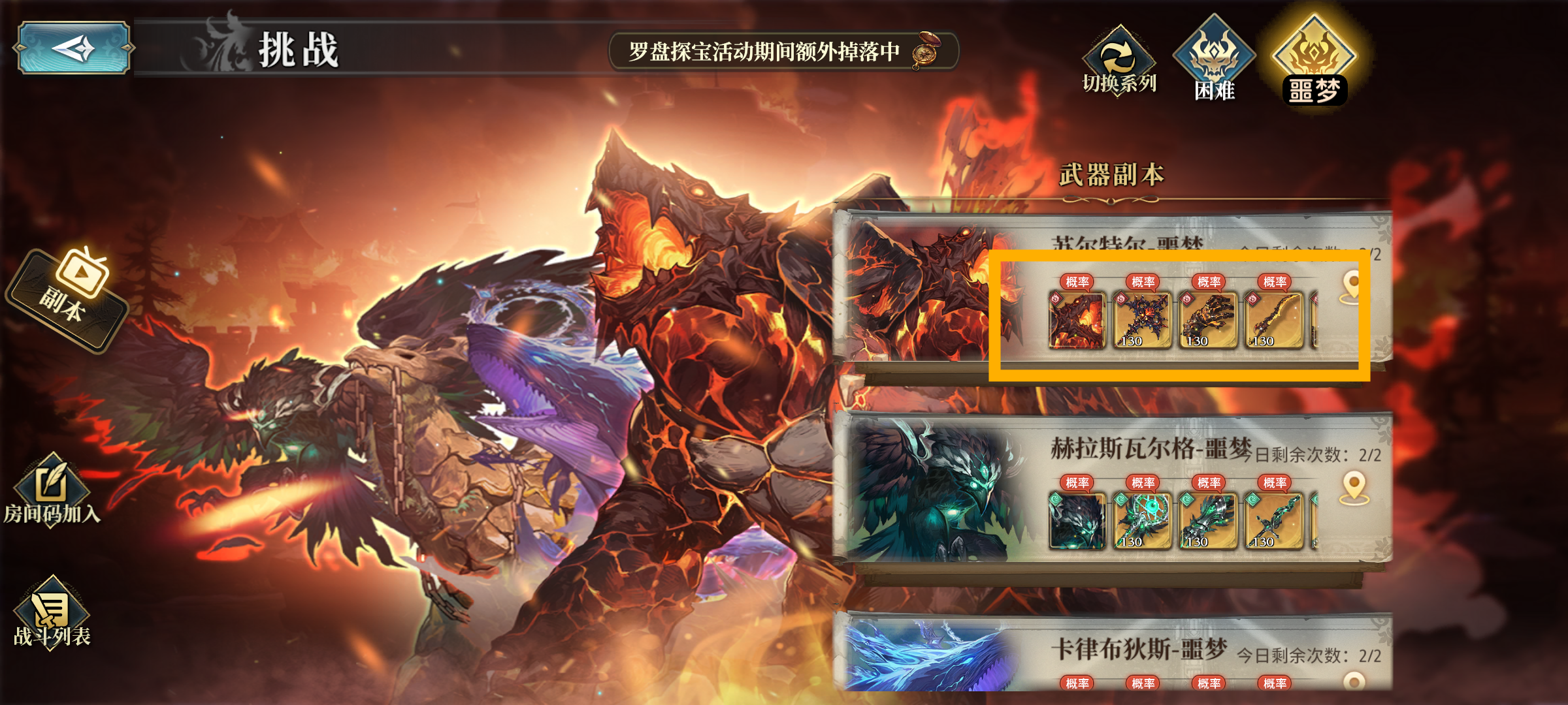 [始源巨兽]系列副本的武器相较于[王国灾厄]系列副本的武器来说,种类更多,[武器的被动]效果更复杂,现在我们就[火属性]队伍应该刷取的副本Boss[苏尔特尔]来详细讲解,在[副本]的各Boss图标下,我们可以看到其掉落的奖励