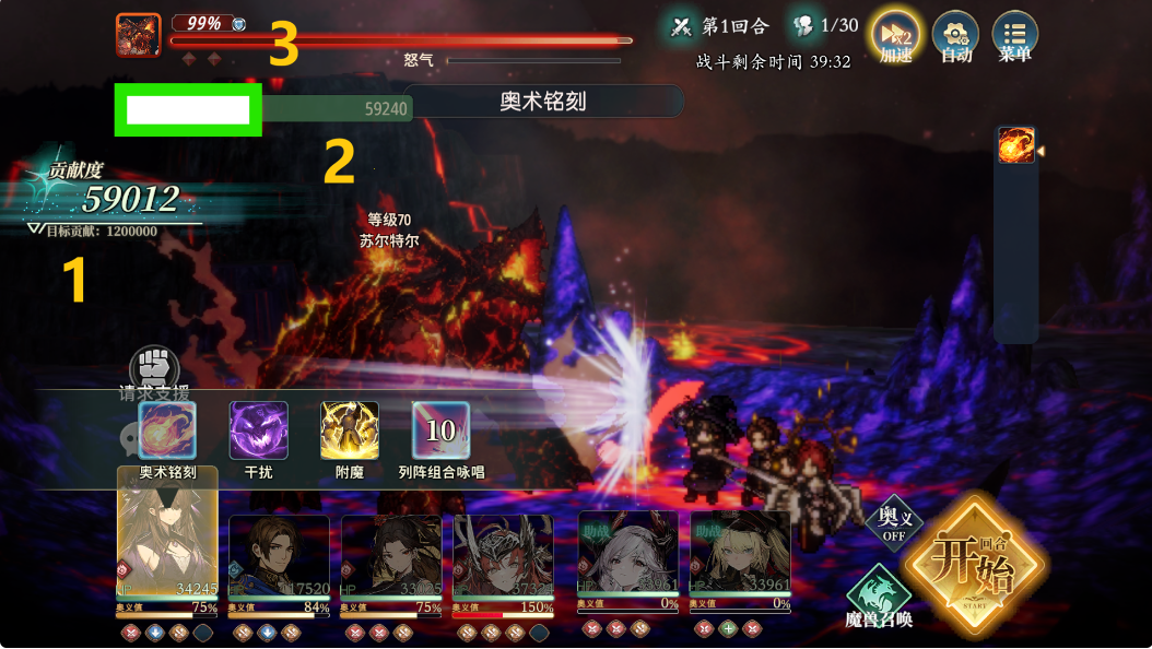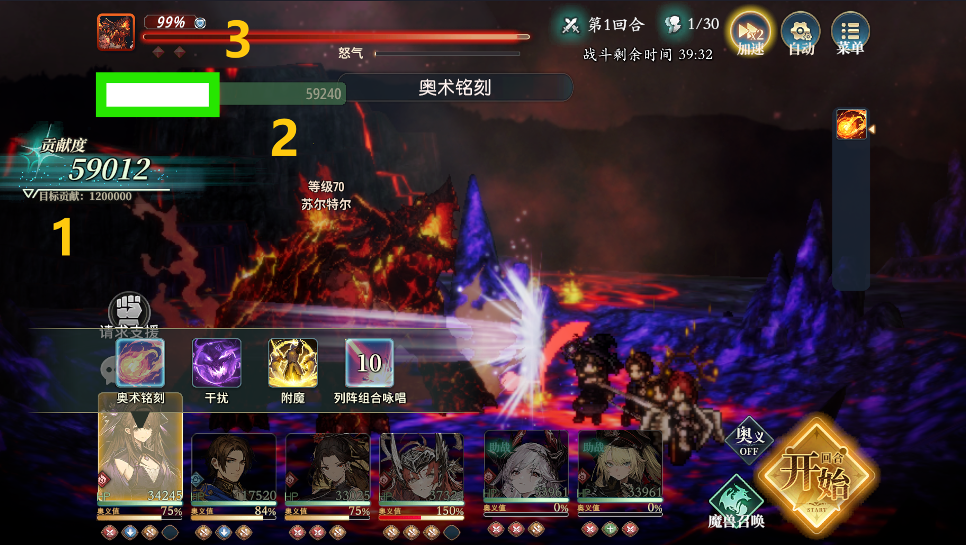 综上:依次释放[列阵组合咏唱]——[灼燃]——[起势-星火]3个技能后,每个角色都达到[奥义值]最大值,再点击[回合开始],每个角色释放[奥义],成功实现[奥义][短线爆发]