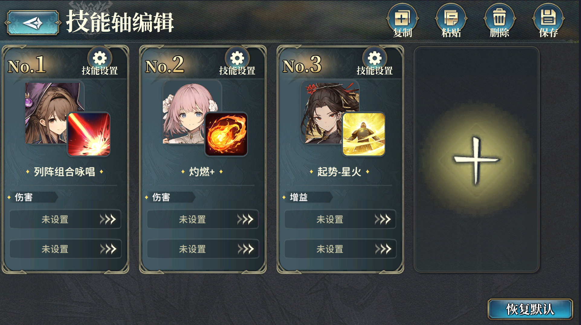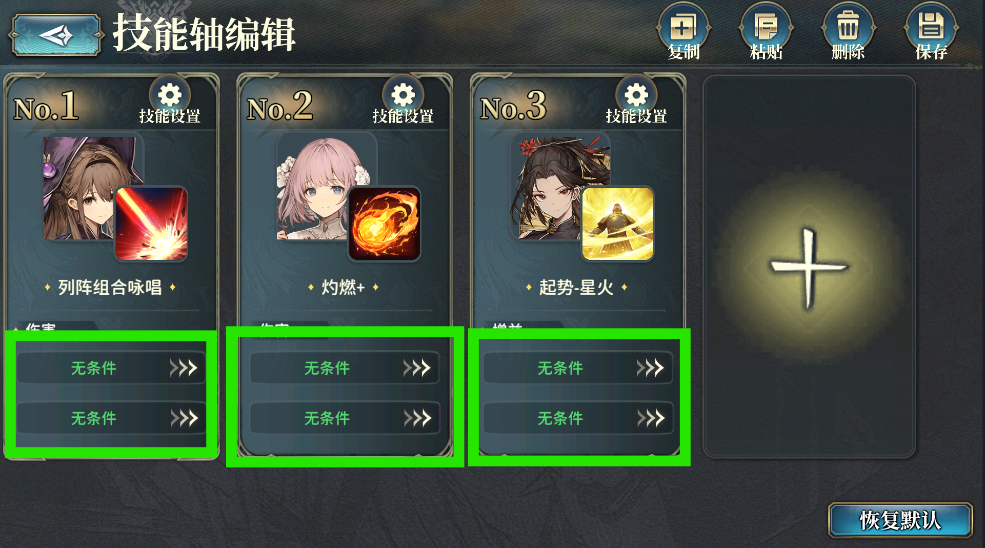 我们的队伍是(3 + 1键)队伍,所以我们在这里只需要添加3个技能再点击[保存],就可以完成[技能轴]的初步编辑,进入战斗后,在[自动战斗]时,系统就会按照[技能轴]中我们编辑的顺序与逻辑,自动释放技能
