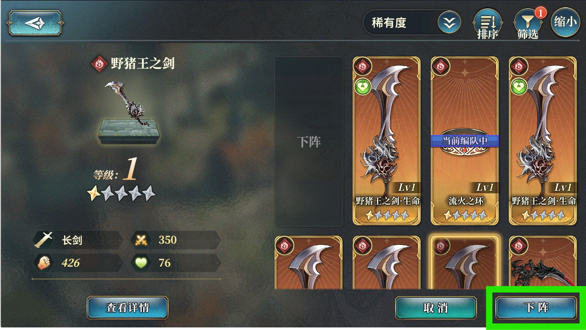 具体流程就是:在[战斗列表]中,在[支援筛选设定]中选中[野猪统领],用我们刚配置好[技能轴]的队伍,[自动挂机]野猪统领——刷好[武器盘]和[魔物伙伴盘]前我们大概率还是打不过,需要求援别人帮我们打,我们的目标是刷出10把如下图所示的[方阵武器][野猪王之剑],装备在我们的[武器盘]上——这个过程有点漫长,新手挂机1天应该就够了