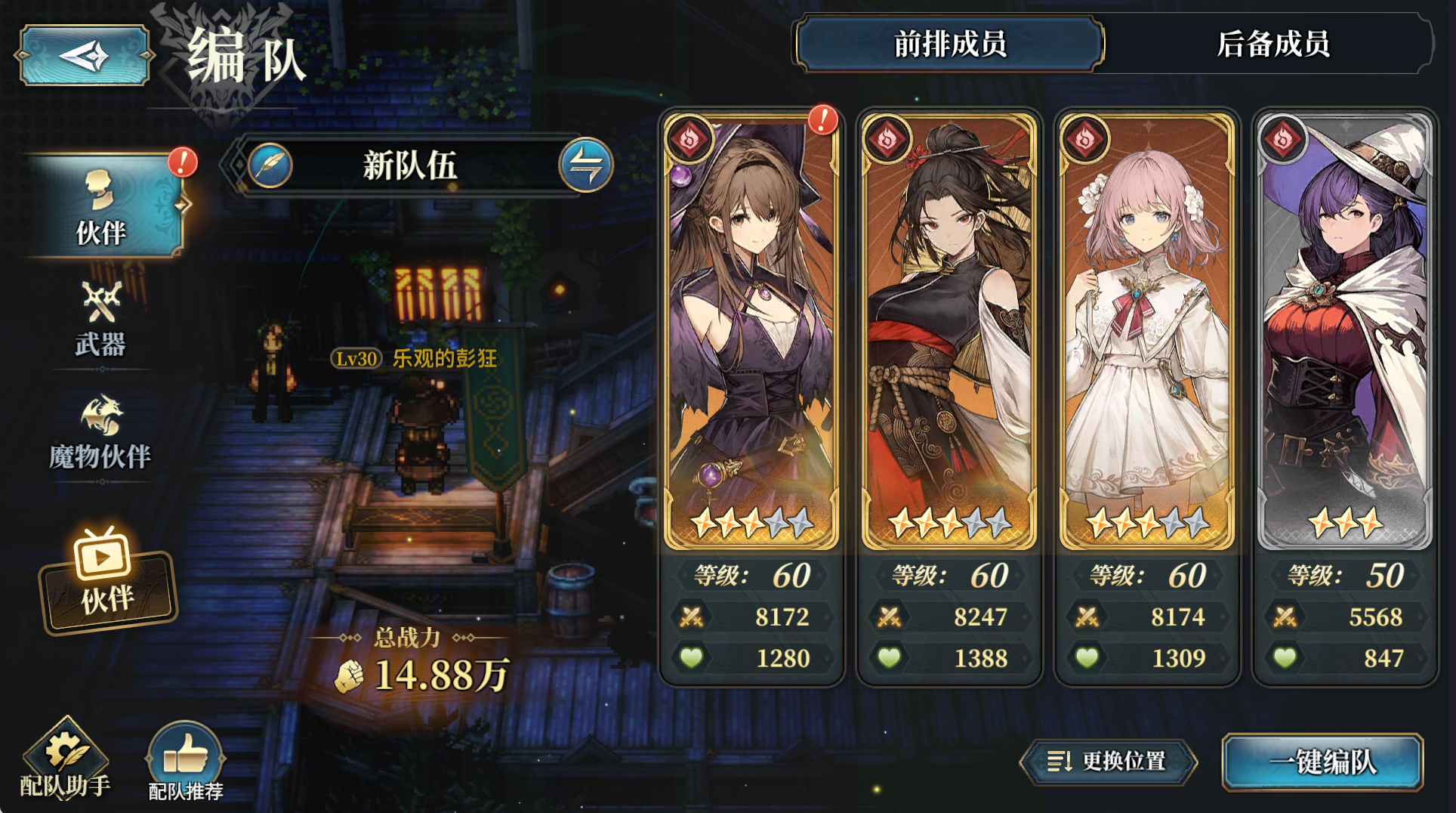 其他[属性]的[法师][职业]其实也可以替换,我们这里选择[火属性][法师]角色是因为她可以享受到[武器盘]和[魔物伙伴盘]的被动效果加成,从而提高该角色的伤害,但其实我们也可以放弃这些伤害,转而选择其他[属性]的且拥有可以提供大量增益效果技能的[法师]角色,增加另外3个角色的伤害——(4输出)有时候不如(3输出1辅助),这主要是因为现在《风之痕迹》的角色很少,单个[属性]内可以选择的角色不多