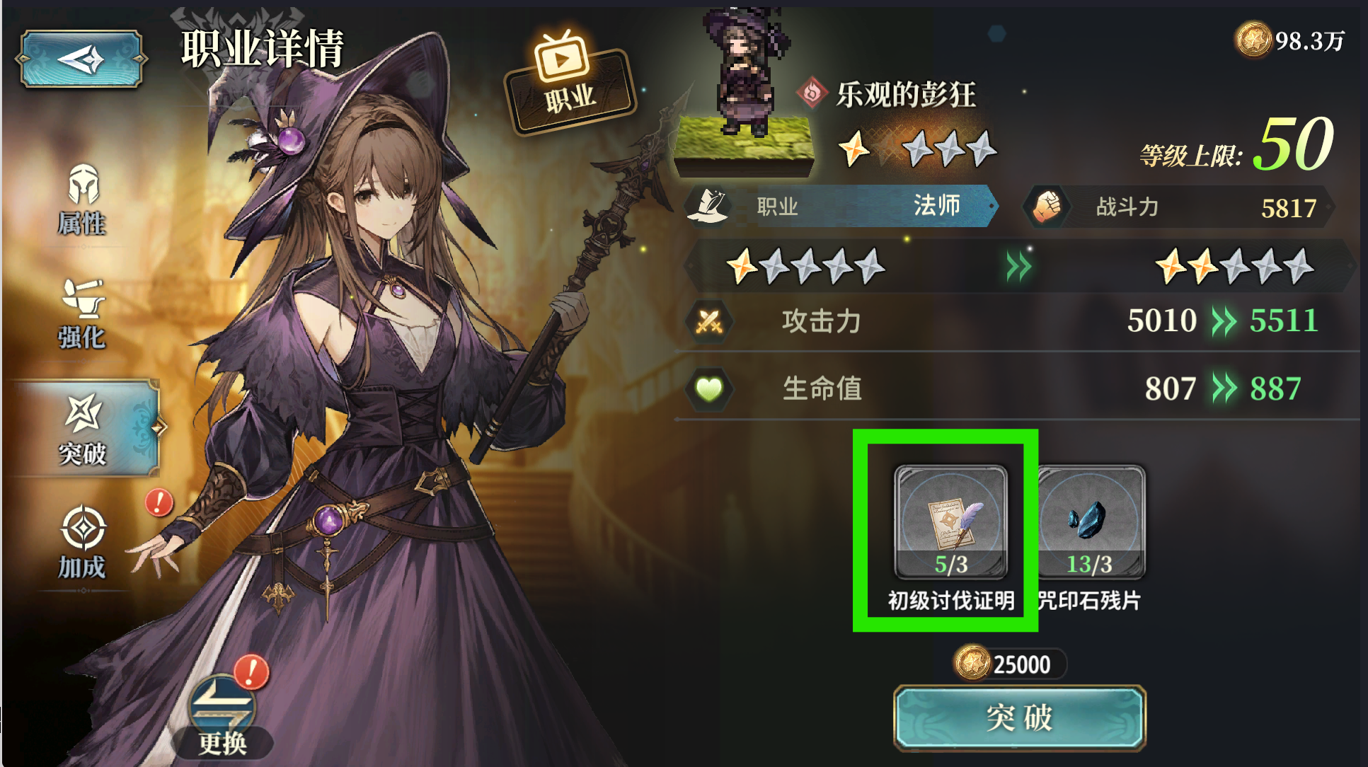 虽然我们现在打不过,但是可以依靠求援来获取奖励,刷取到足够数量的材料后,我们在[融合炉]系统中合成[法师][转职]材料,并在主角的[转职]页面进行[转职]