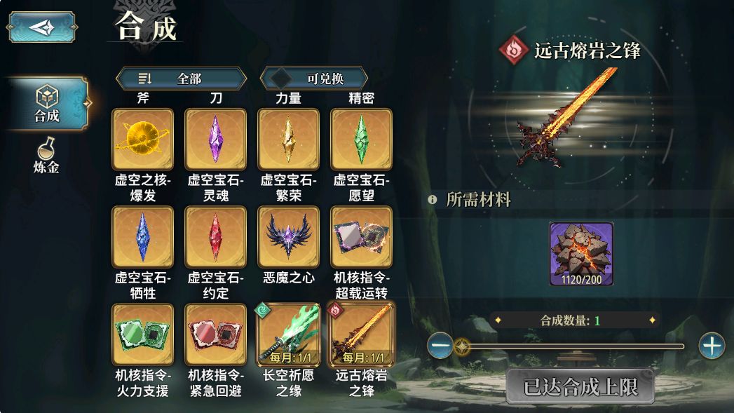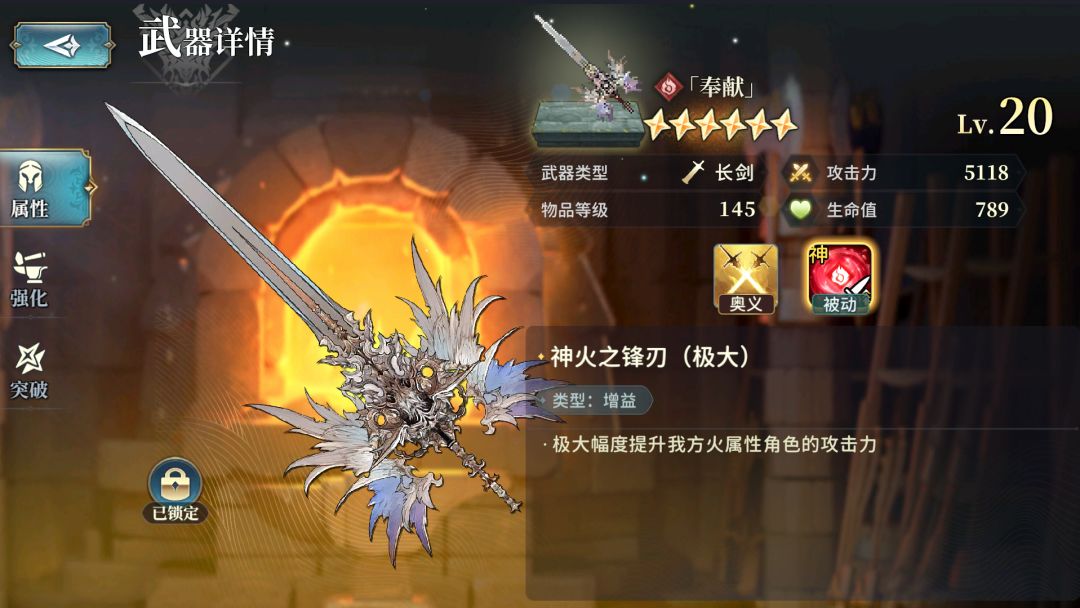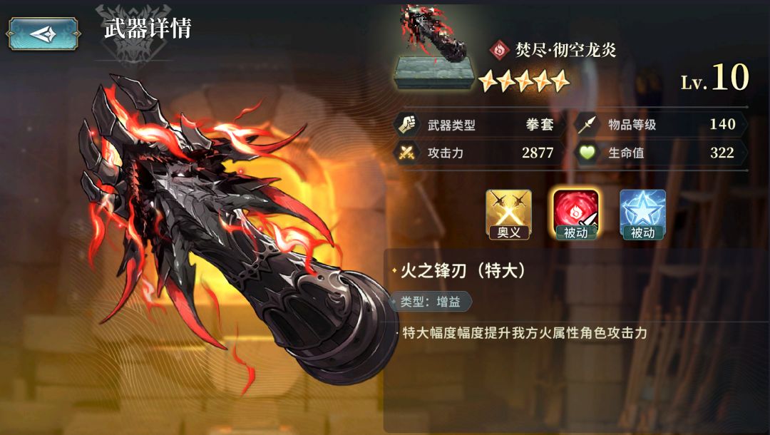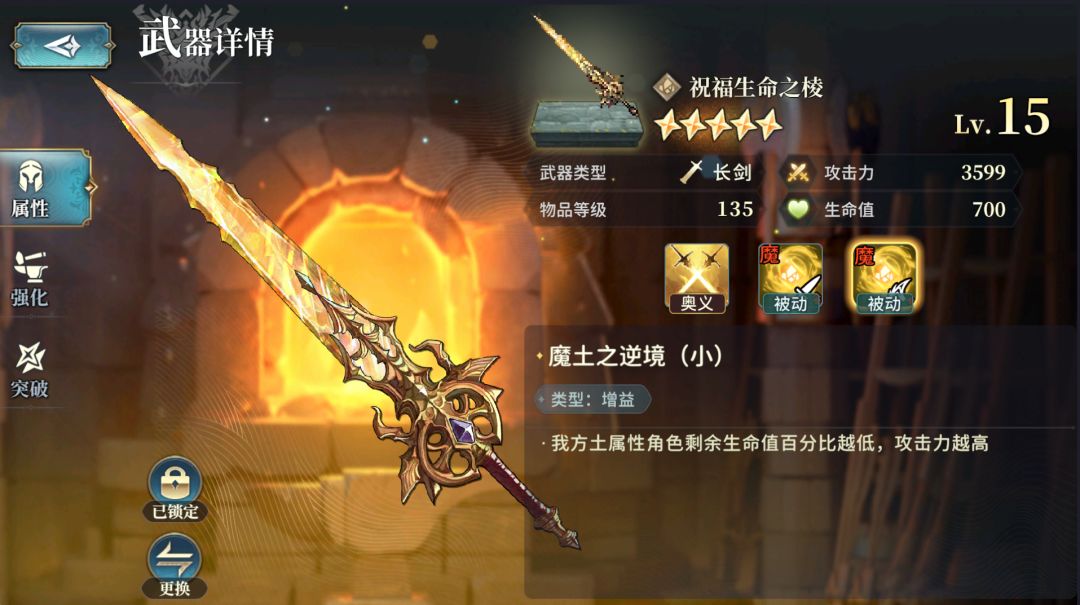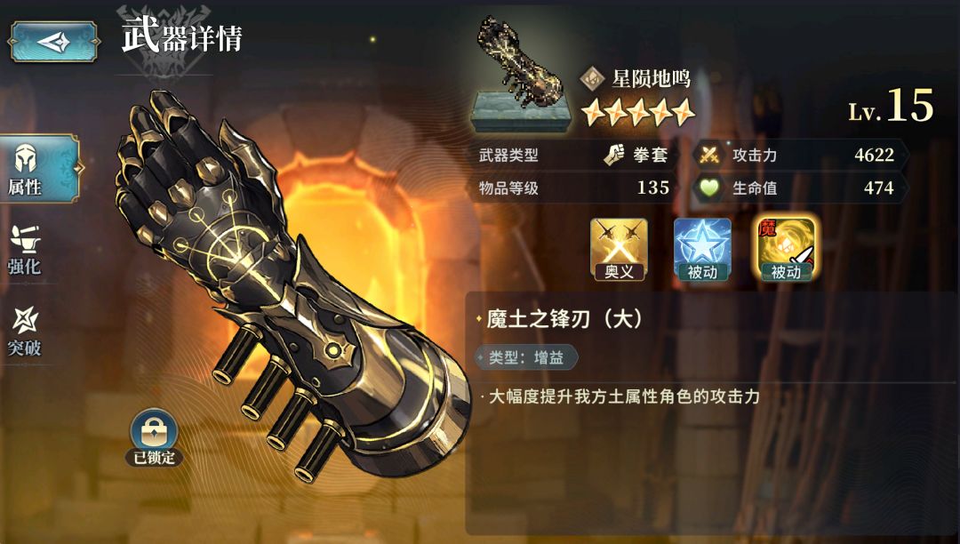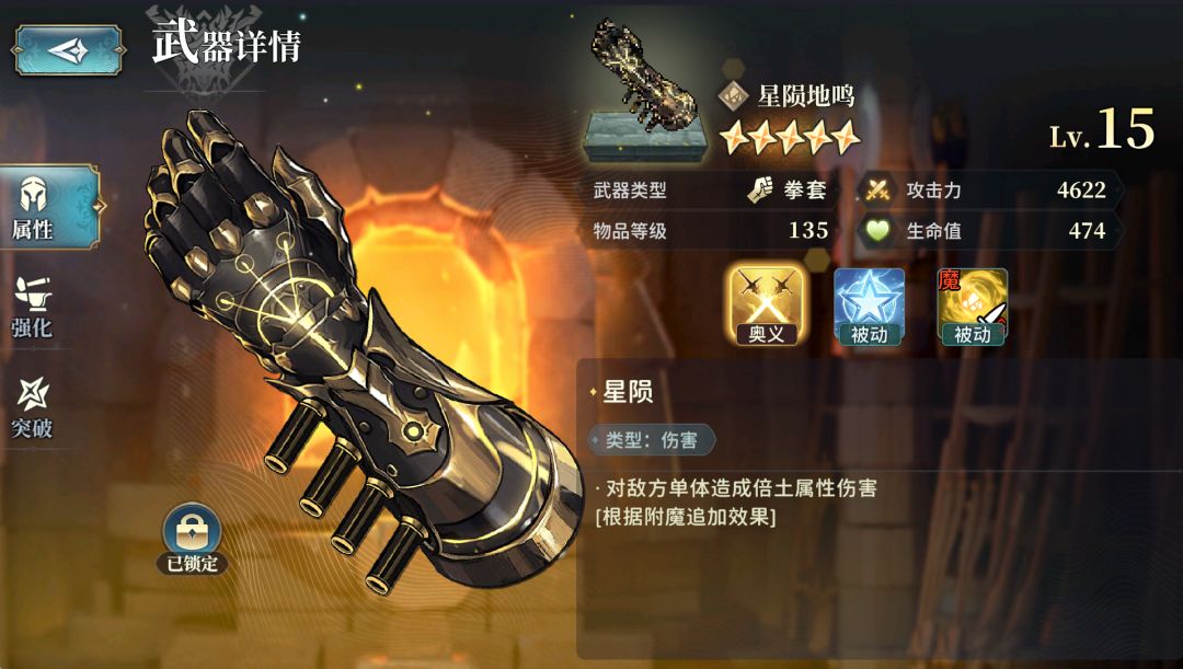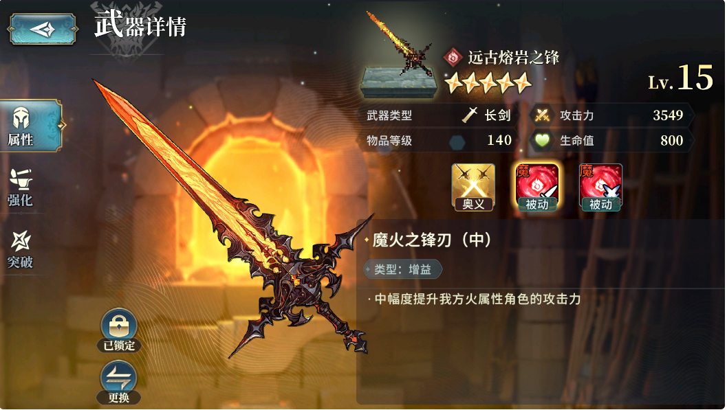 其实有很多武器需要多刷几把,就比如我们[火属性]的[始源巨兽]副本掉落的这把135武器[远古熔岩之锋],最好刷8把15级5星的留着备用(6把一般也够用)