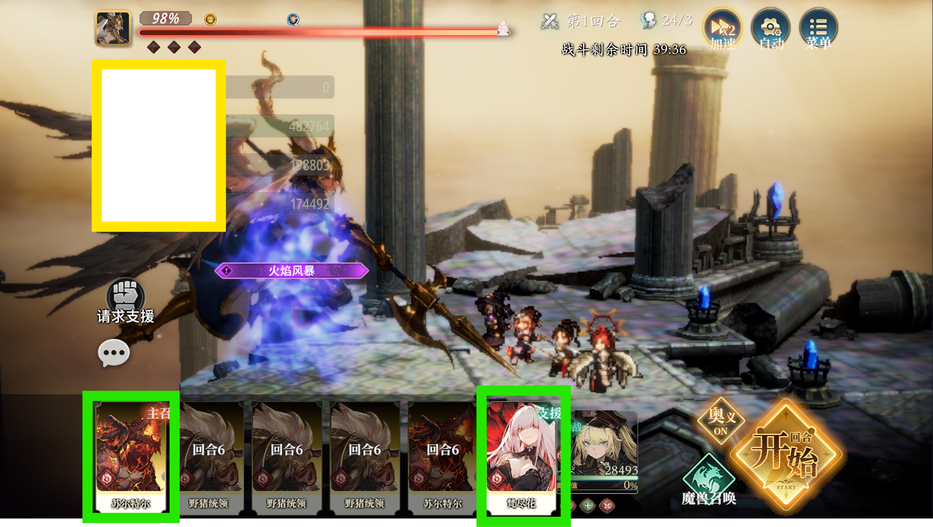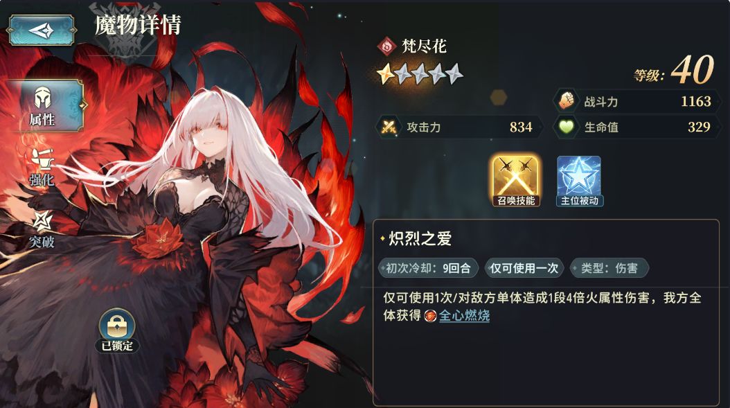 但是在技能轴中,我们无法编辑[助战魔物]的[召唤技能],也就是说:我们如果想用[梵尽花]的[召唤技能]的话,必须自己抽1个,而且[梵尽花]的[召唤技能]强度很高,[全心燃烧]是特殊的Buff效果:[攻击大幅UP],这个是可以提高[伤害上限]的Buff之一