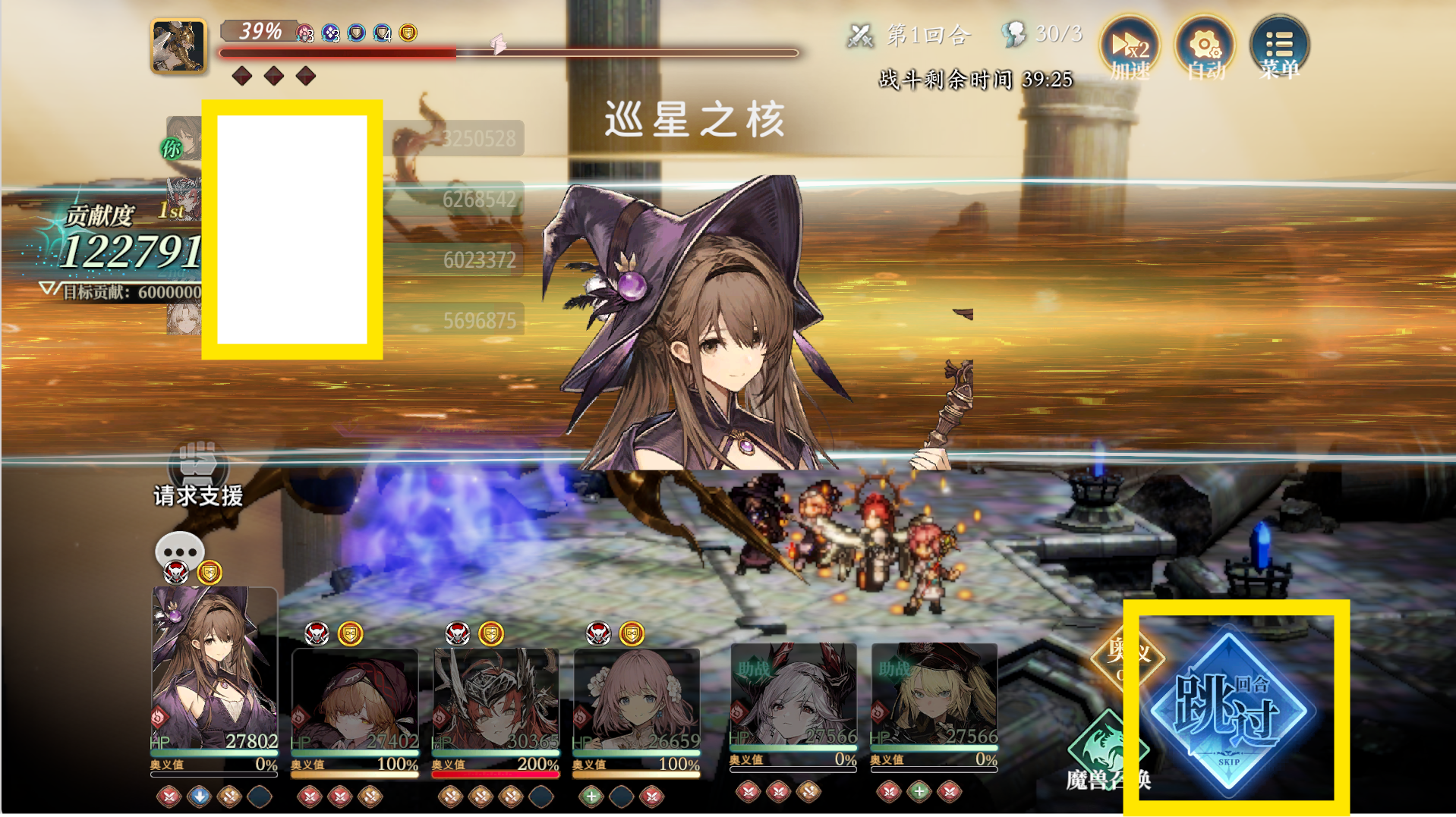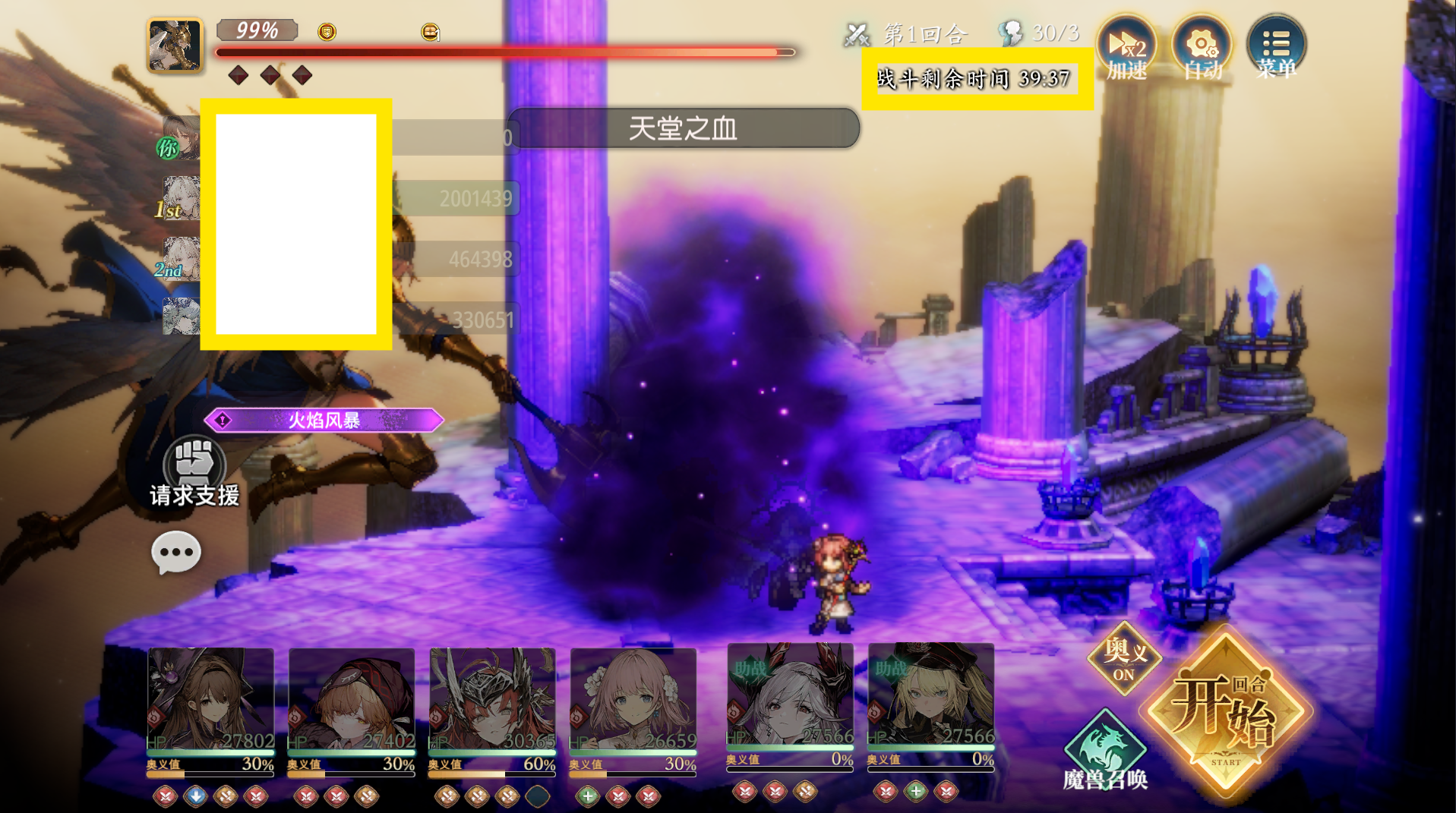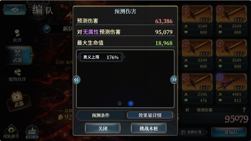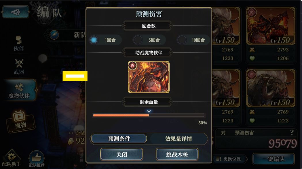 我们第二个需要关注的就是[武器盘]的实战表现:想要知道这个我们就需要用我们配置的[武器盘]去进行实战,例如:我们用我们的新手攻略配队 + 如下[技能轴] + 如下[武器盘] + 如下[魔物伙伴盘],在[双面]的情况下进行[始源巨兽]Boss[苏尔特尔]的挑战,并只输出1回合(只放1轮[奥义])