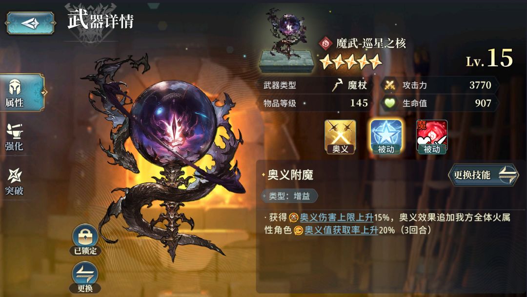 这里再说一个特殊的:[机神武],这是定期开放的特殊活动中获得的特殊武器,4种[属性]各有1把,不在[武器制作]系统里面,类似于[魔武]、[神武]的效果,[武器的奥义]有附魔追加效果,可以附魔,[魔武器被动]给[攻击力(魔)],不过弱一点——一次活动只能获得1把15级5星的[机神武]