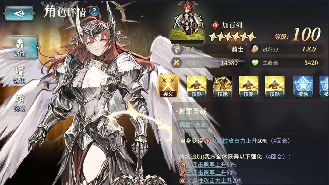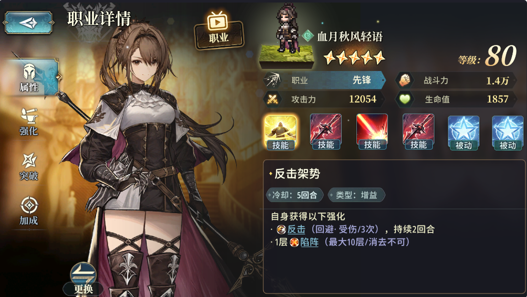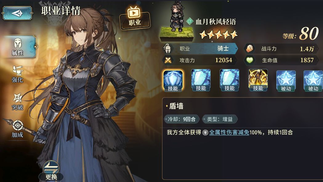 然后是:[骑士],该[职业]的主角的技能可以提高队伍的生存能力,主要是靠下图所示的技能[盾墙],100%的全属性减免1回合基本等于全队无敌1回合,在Boss释放高伤害技能时帮队伍挺过难关,但这一般需要手操,且要求你对Boss的机制有比较深的理解,一般还是建议[转职]为[先锋],技能基本随便放,简单粗暴伤害高