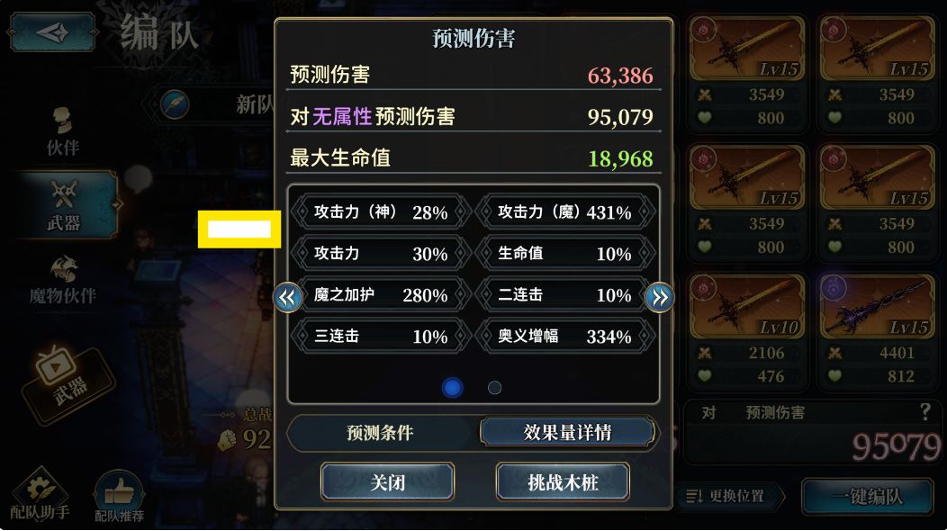 一个是我们的[武器数值详情],这里详细列出包含[主位魔物]的[主位被动]在内的,[武器盘]内所有武器提供的[武器的被动]的详细数值合计值,由上文我们知道,不同类型的[攻击力]是不同的乘区,这里进一步说明:[武器数值详情]中所有分开的量都是独立的乘区,我们在考虑[攻击力]的时候,将下列的所有数值都作乘法,算一下就行了